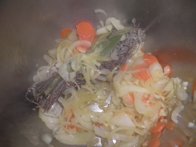 - Émincez les oignons et l’ail. Coupez la carotte en rondelle. Les mettre dans une sauteuse avec un fond d’huile chaude. Laissez cuire à feu moyen jusqu’à ce que les oignons soient translucides.
