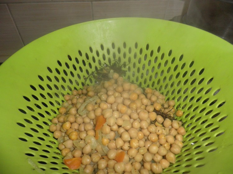 - Lorsque les pois chiches sont cuits, filtrez l’eau de cuisson. Enlevez le bouquet garni.