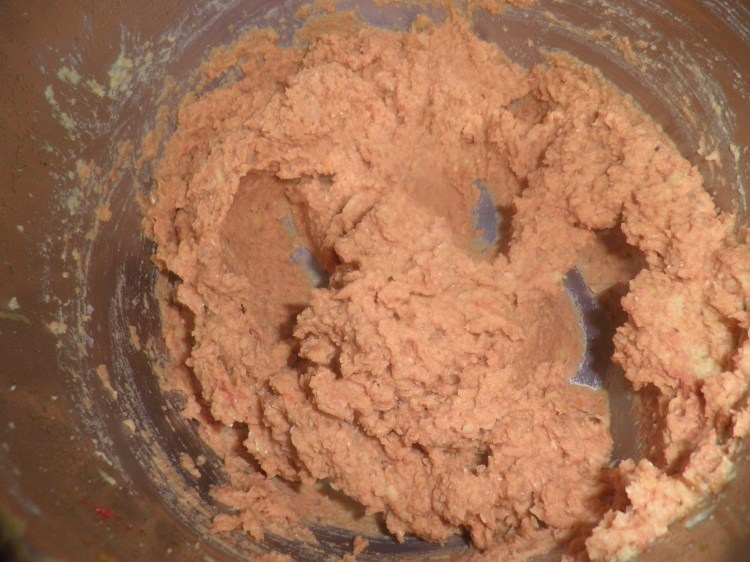 Mixez les pois chiches avec les carottes, les oignons, l’ail. Ajoutez le concentré de tomate et mélangez.