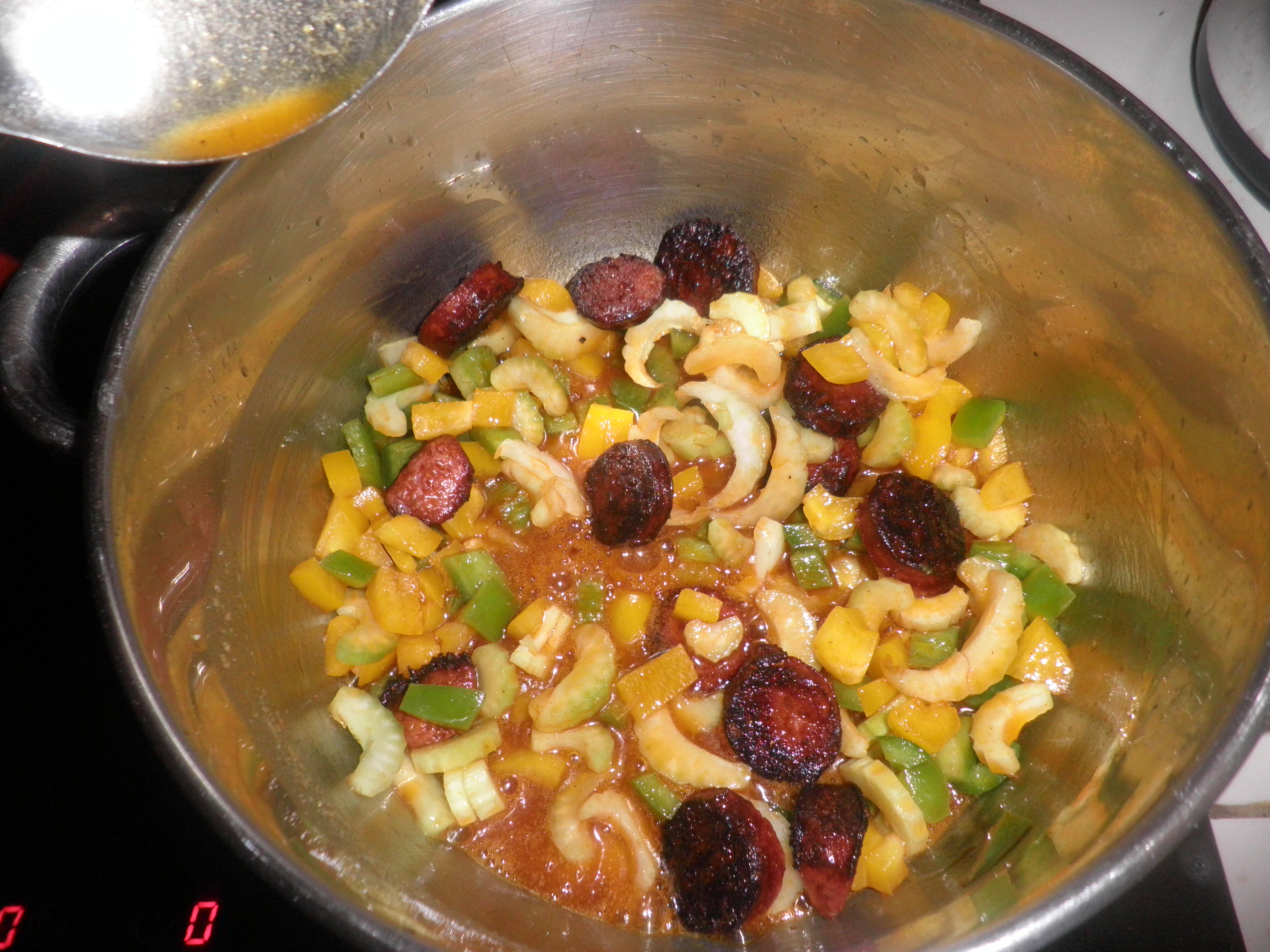 4. Coupez en rondelles le céleri, en petits dés les poivrons et les oignons. Coupez en quartier les tomates épépinées.  Ajoutez tous ces ingrédients au chorizo.