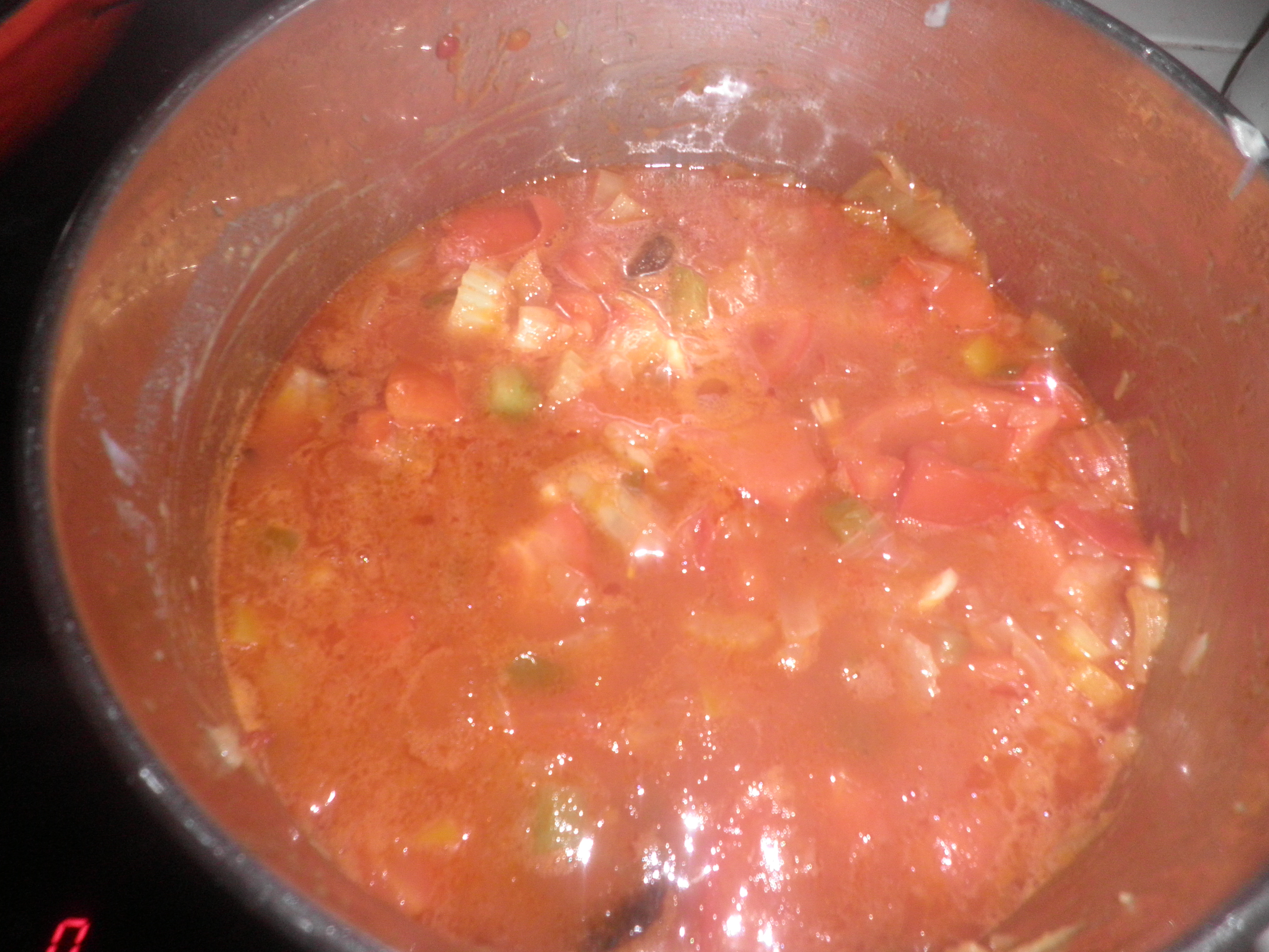 5. Incorporez les tomates, l’ail haché, puis le bouillon. Laissez cuire à feux doux jusqu’à ce que les légumes soient cuits.