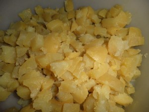 - Cuire les pommes de terre à la vapeur. Les éplucher et les couper en dés.