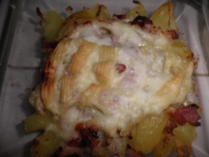 - Dans le plat à gratin, versez les pommes de terre, puis le mélange « allumettes/oignons », puis le fromage.