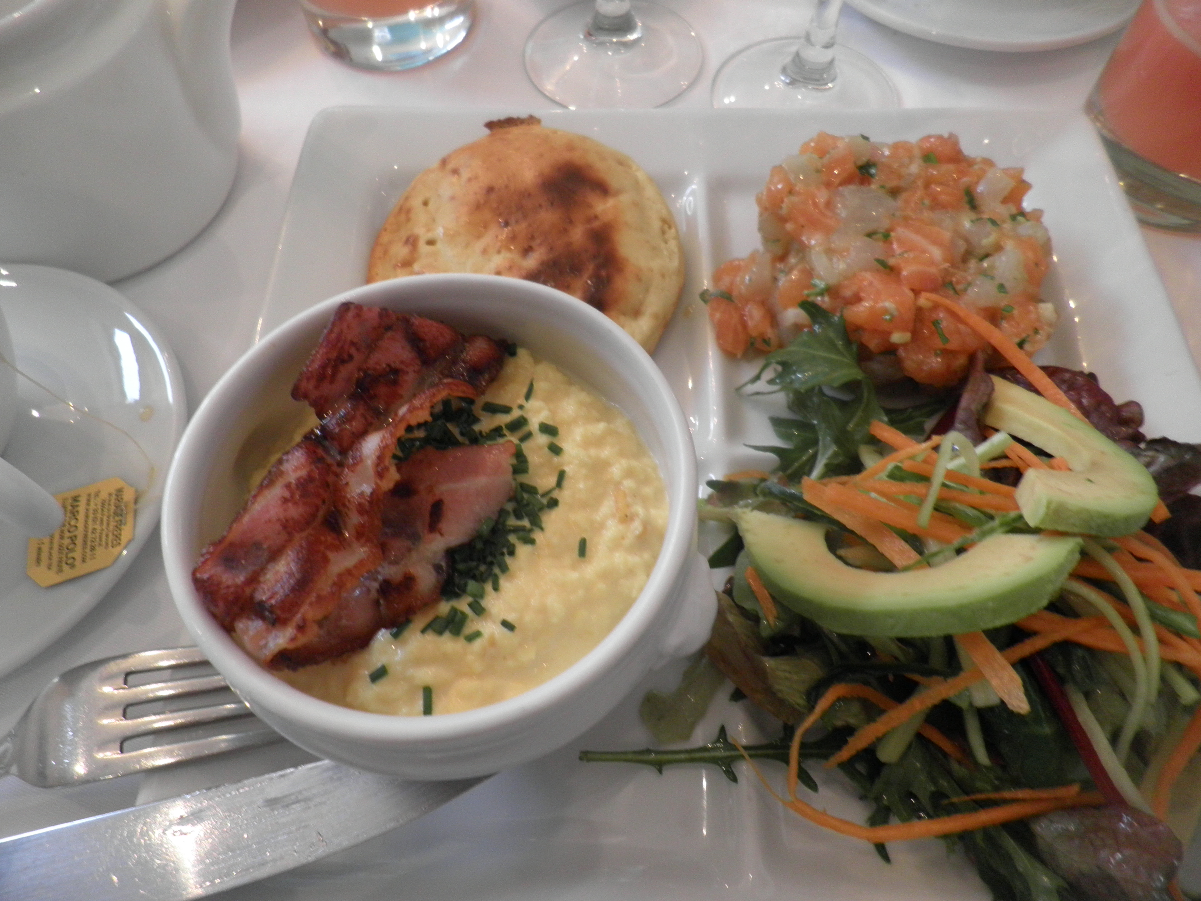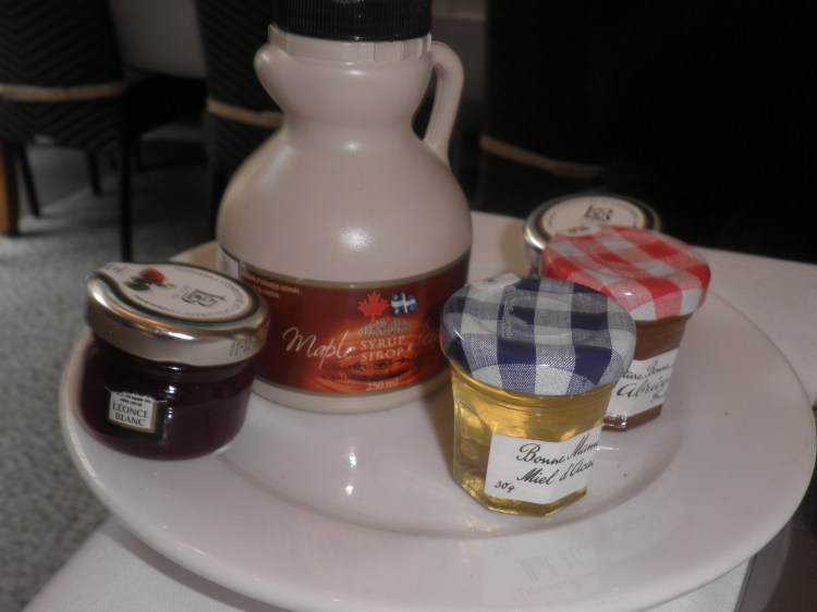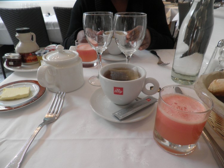Le brunch comprend: une boisson chaude (thé, café ou chocolat), une boisson froide (jus d’orange ou jus de pamplemousse), du beurre, des confitures, du sirop d’érable, des oeufs brouillés, un tartare de saumon, un pancake, de la baguette, de la brioche, des muffins, des gâteaux à base de pâte d’amande. Il n’y a pas de buffet mais nous sommes reparties repues ! 🙂