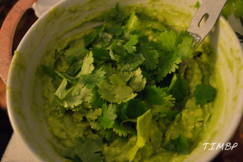 J’ajoute ensuite les oignons et les tomates. Je finis avec les épices. Il faut savoir que le Guacamole n’est pas forcément pimenté. Au Mexique, j’ai découvert une recette sans piment. Et voilà ! Done !