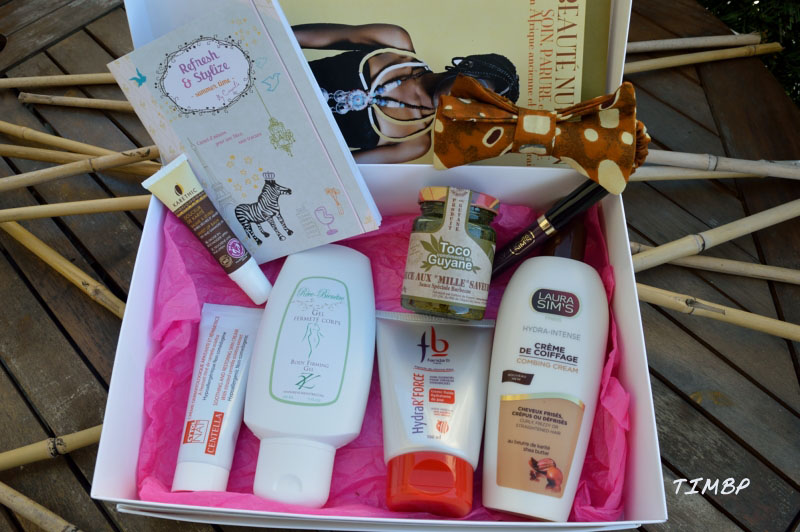 • Laura Sims: dans chaque box, il y aura un produit de maquillage (base de teint matifiant ou un ral ou un gloss) et un produit capillaire (la crème de coiffage au beurre de Karité – 250 ml).