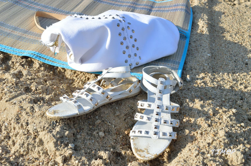 Le sac et les chaussures ont eux aussi été shoppés chez Mango Outlet. Je ne porte pas de talons ce mois-ci. Je n’en porte pas pour aller à la plage. Mais, je déteste les tongs. Elles me font mal aux pieds. Je préfère les sandales ou les spartiates. J’aime beaucoup les détails un peu rock de cette paire. Le sac est en jean blanc. Il a deux jolis zip sur les côtés.