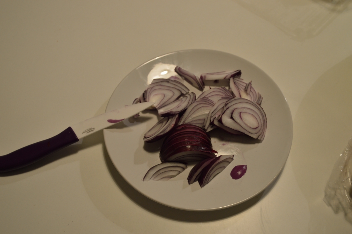 Pendant la cuisson des steaks, j’ai émincé l’oignon. J’utilise la même poele pour cuire les oignons Non, je n’aime pas faire trop de vaisselle. Puis, je déglace avec un filet de scotch. L’alcool parfume parfaitement les oignons.
