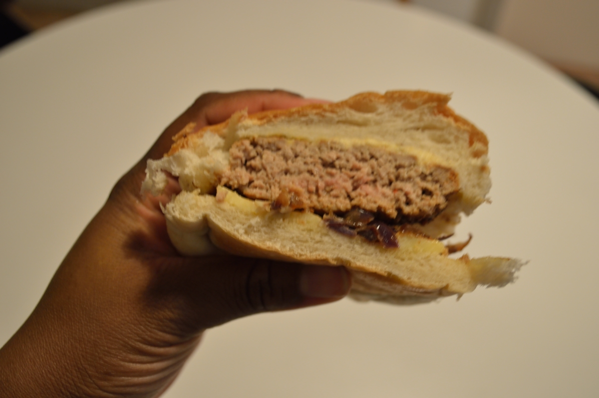Et là on arrive dans la phase de montage, je coupe en deux chaque bun ou brioche. Sur la partie inférieure, je place des morceaux de cheddar, puis les oignons nouvellement confits et enfin le steak. Je tartine la partie supérieure avec du houmous.