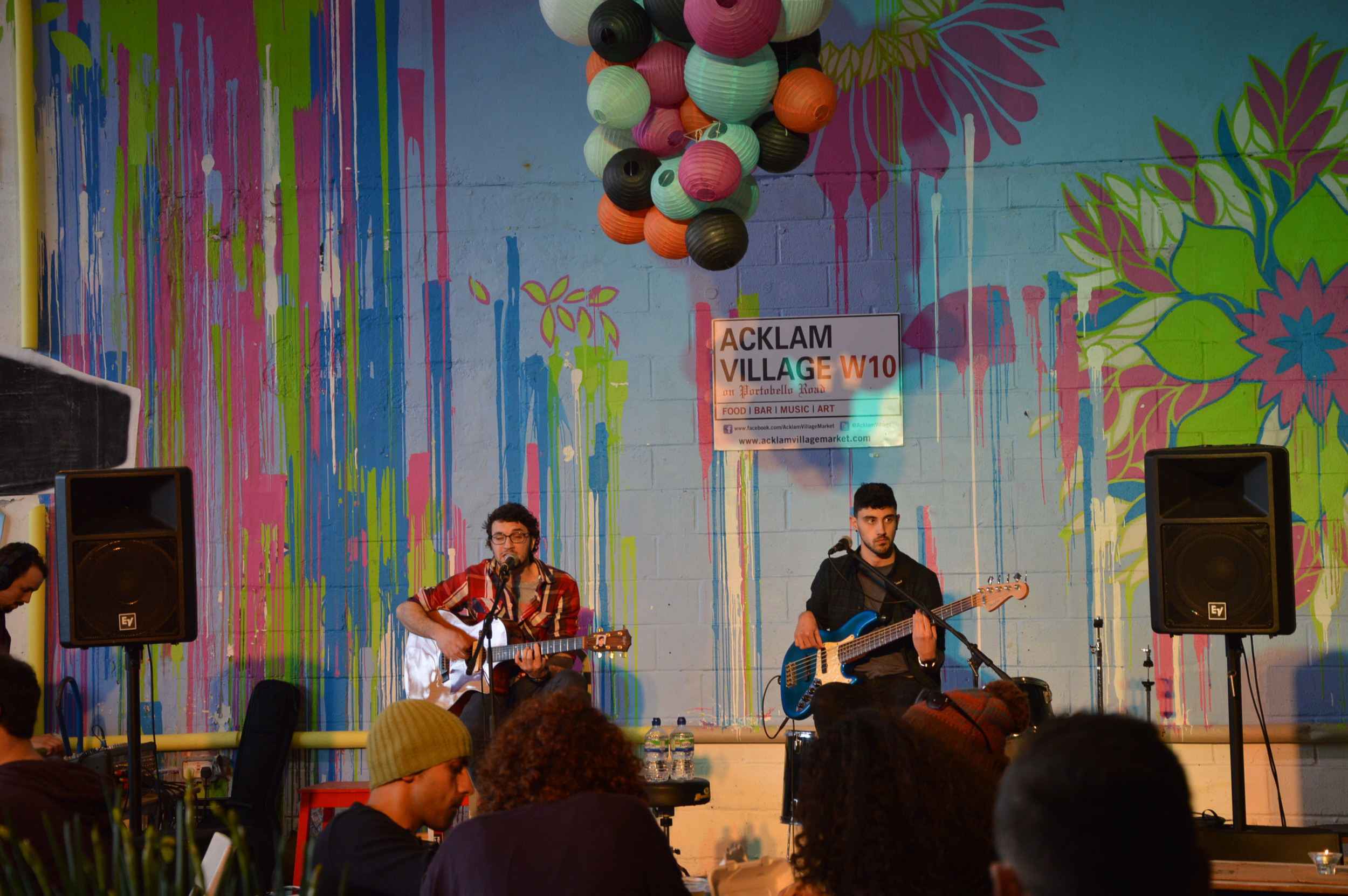 Derrière les stands alimentaires, se trouve un bar de jour où les lives musicaux s’enchaînent. Je me suis posée là pour savourer mon burger. J’adore les sessions acoustiques. Je peux apprécier n’importe quel style musical à partir du moment où des musiciens jouent des instruments.