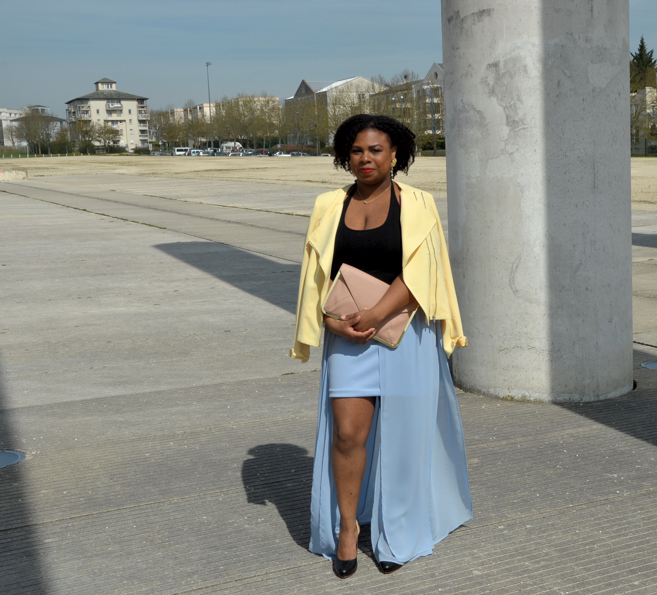 Ce mois-ci, je me suis lâchée question couleurs. Ma tenue comprend du jaune, du bleu et une touche de rose nude. Ahah ! Je crois que je n’ai jamais mis autant de couleurs en dehors des imprimés. 😉