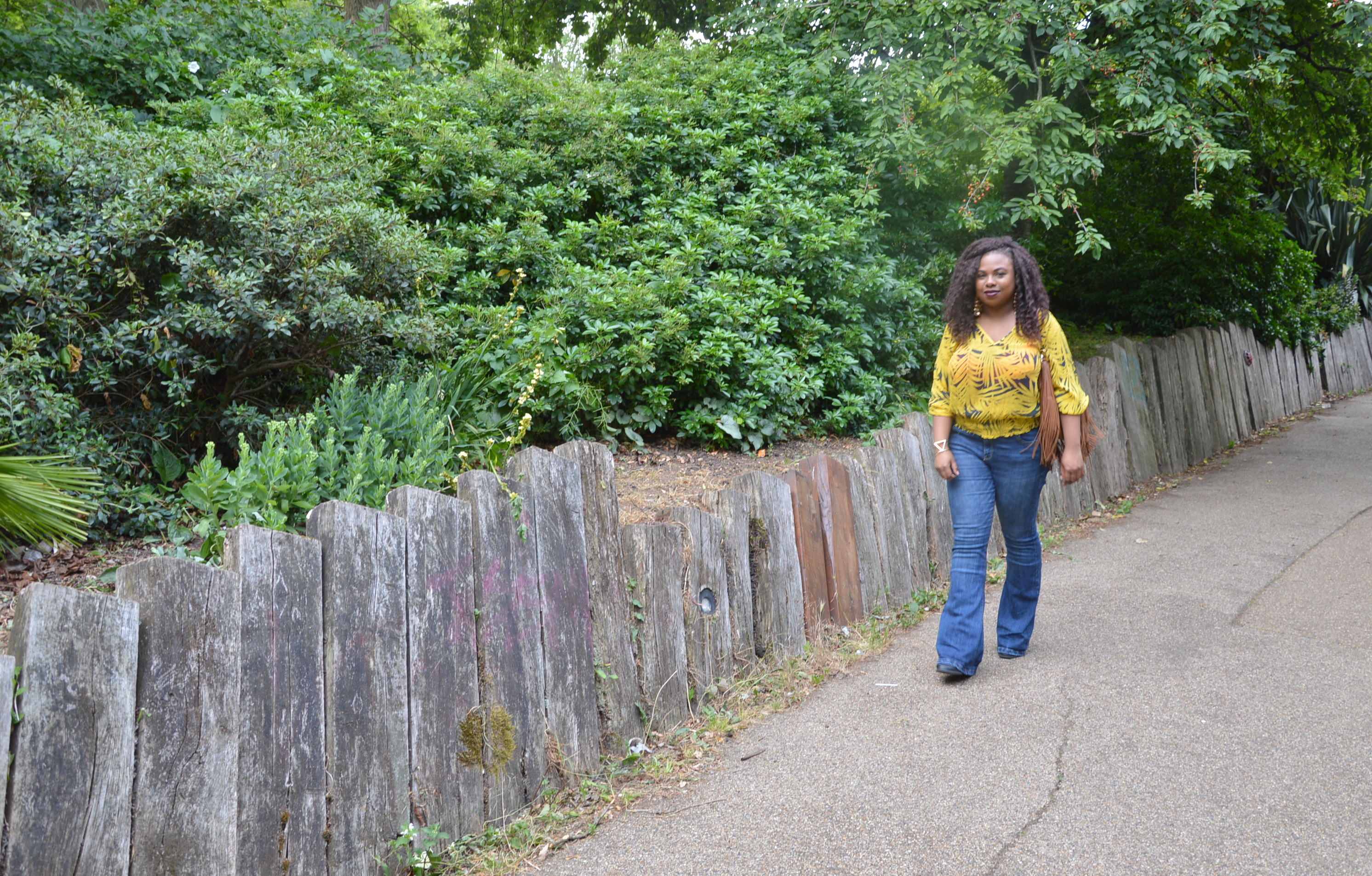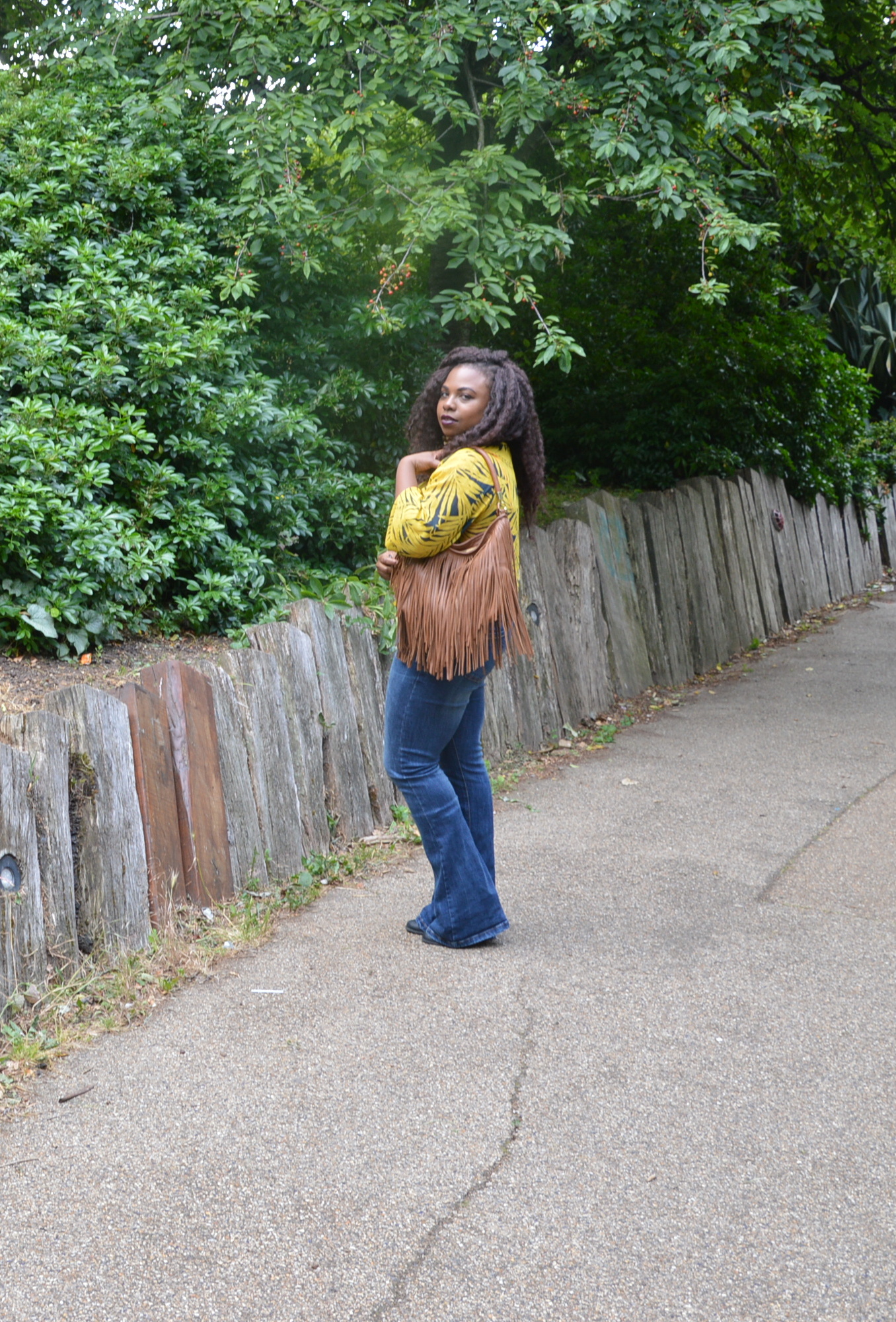 Ma tenue/ Outfit: Top/ Blouse – H&M, Jean Flare/ Flares jean – Primark, Sac à main à frange/ Fringed hand bag – H&M, Boucles d’oreilles/ Earrings – H&M, Boots – Primark (old), Manchette/ Cuff- Primark (old)