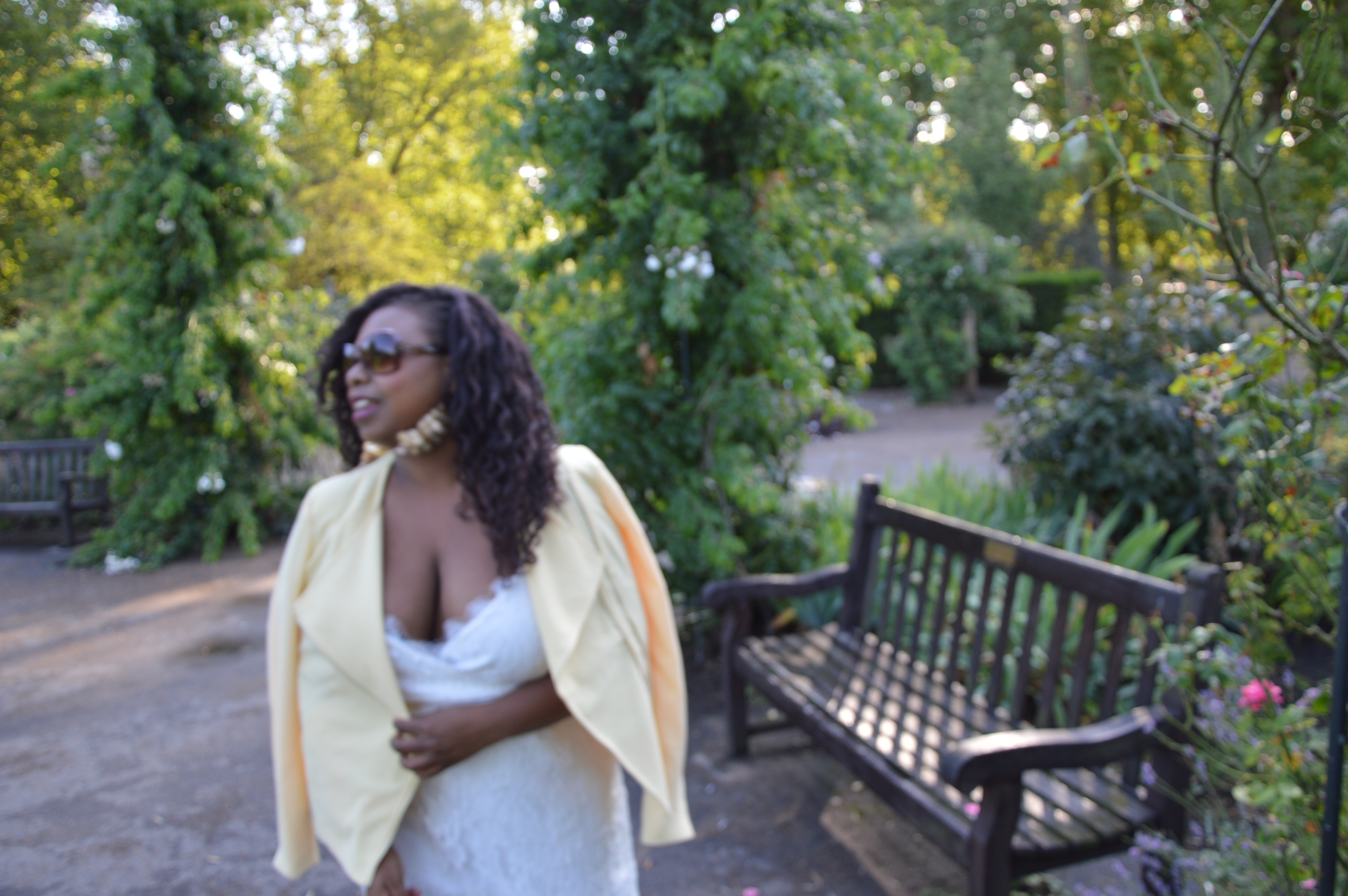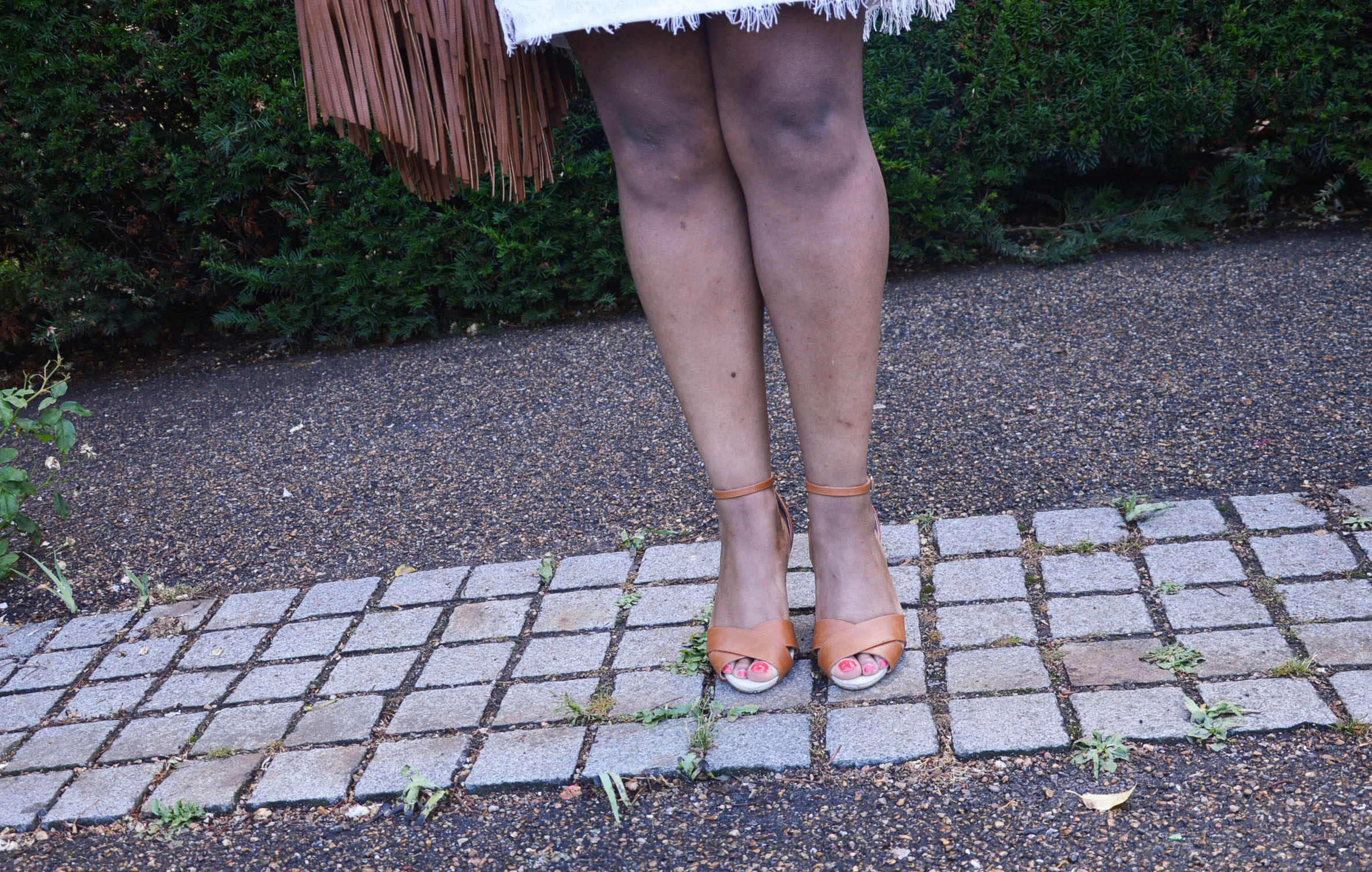 Look/Outfit: Robe blanche en dentelles / Lace white dress- New Look , Veste biker – Etam vu ici, Sandales compensées / wedges sandales- Monsoon, Sac à main à franges / Fringed bag – H&M vu la, Boucles d’oreilles/ Earring – H&M, Lunettes de Soleil Papillon/ Sunglasses – Primark.