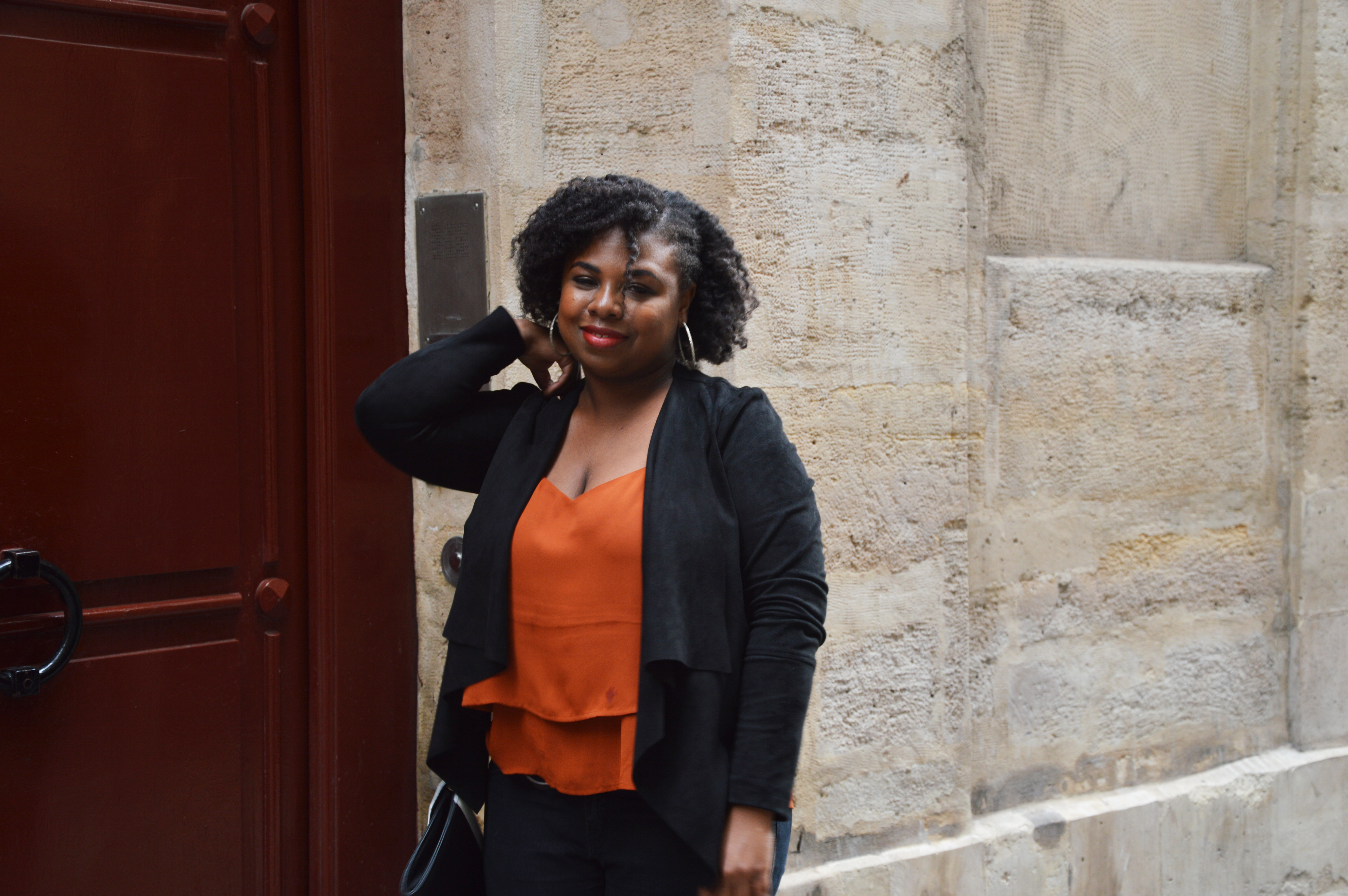 The top is a pumpkin colored and ruffled camesole. It gives a autumnal look to my outfit. Ok I know, we’re not in autumn yet but we aren’t really in summer either! I love the lightness of this kind of tops. They have an effortless aspect that I love. The cut is fluid while revealing neckline. It falls perfectly. I usually fit in size 44-46, the model I wear is an XL.