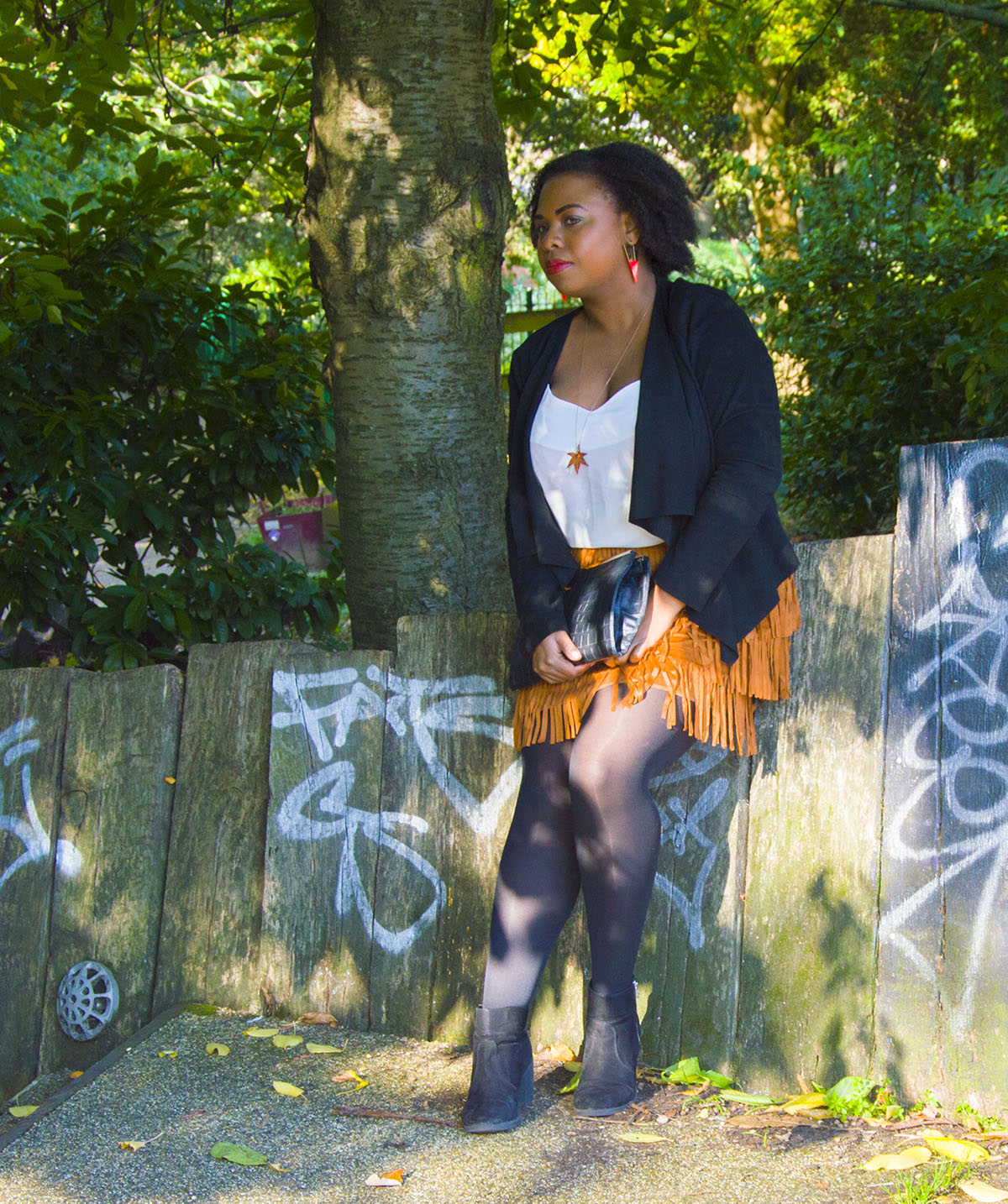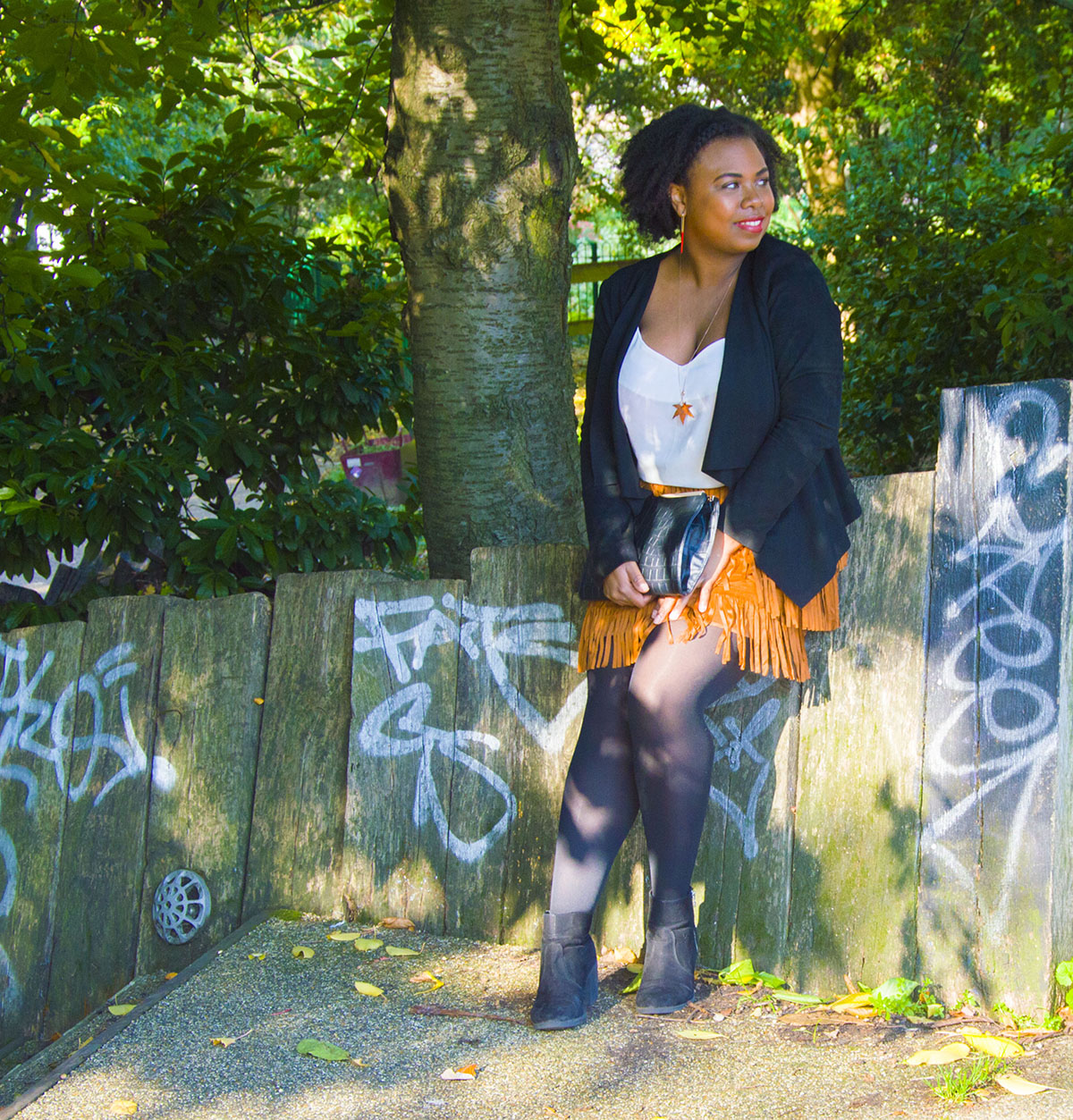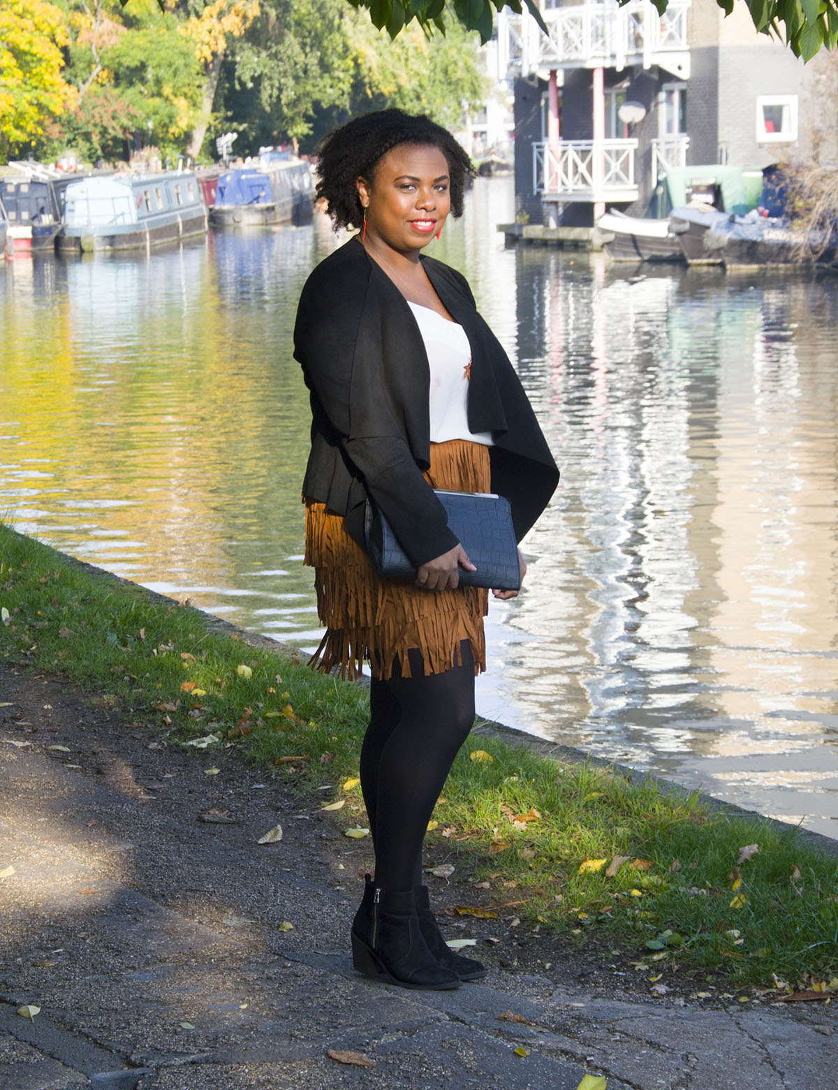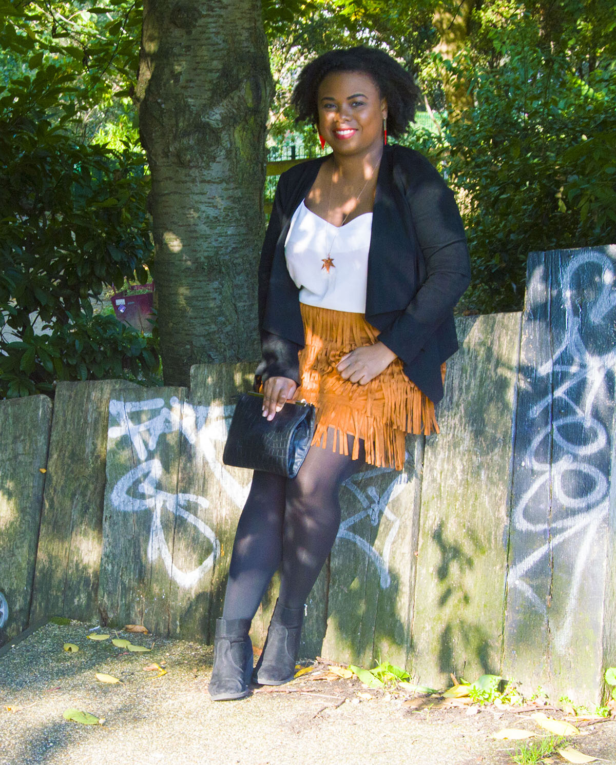 La tenue /Outfit: Veste noire en suèdine noire / Black suede jacket Pimkie, Camesole blanche / White cami top – Asos, Jupe Camel à franges / Fringed Camel Skirt – ‘Fashion Union‘ Asos, Bottine / Boots(old) – H&M, Boucles d’oreilles / Earrings – H&M en magasin uniquement/ in shop only, Colliers / Spitafield market.