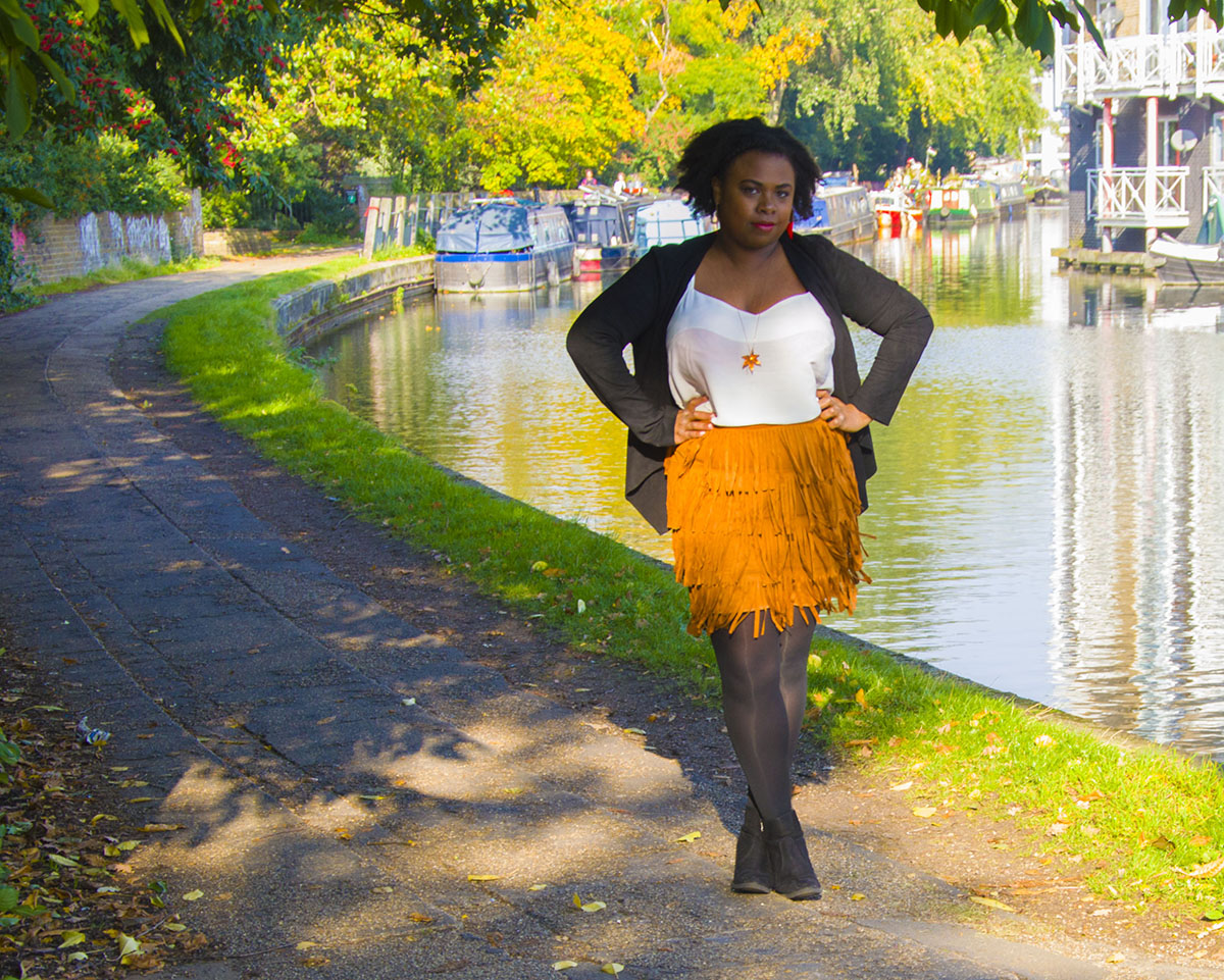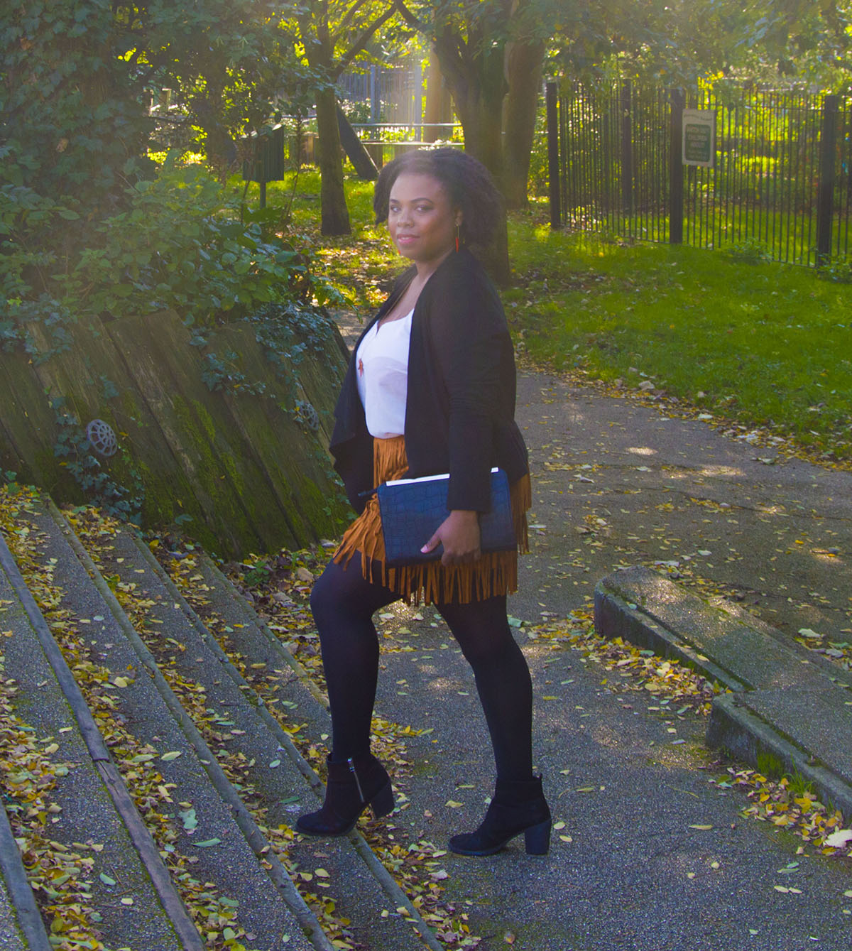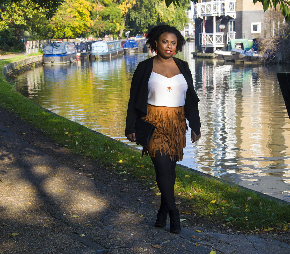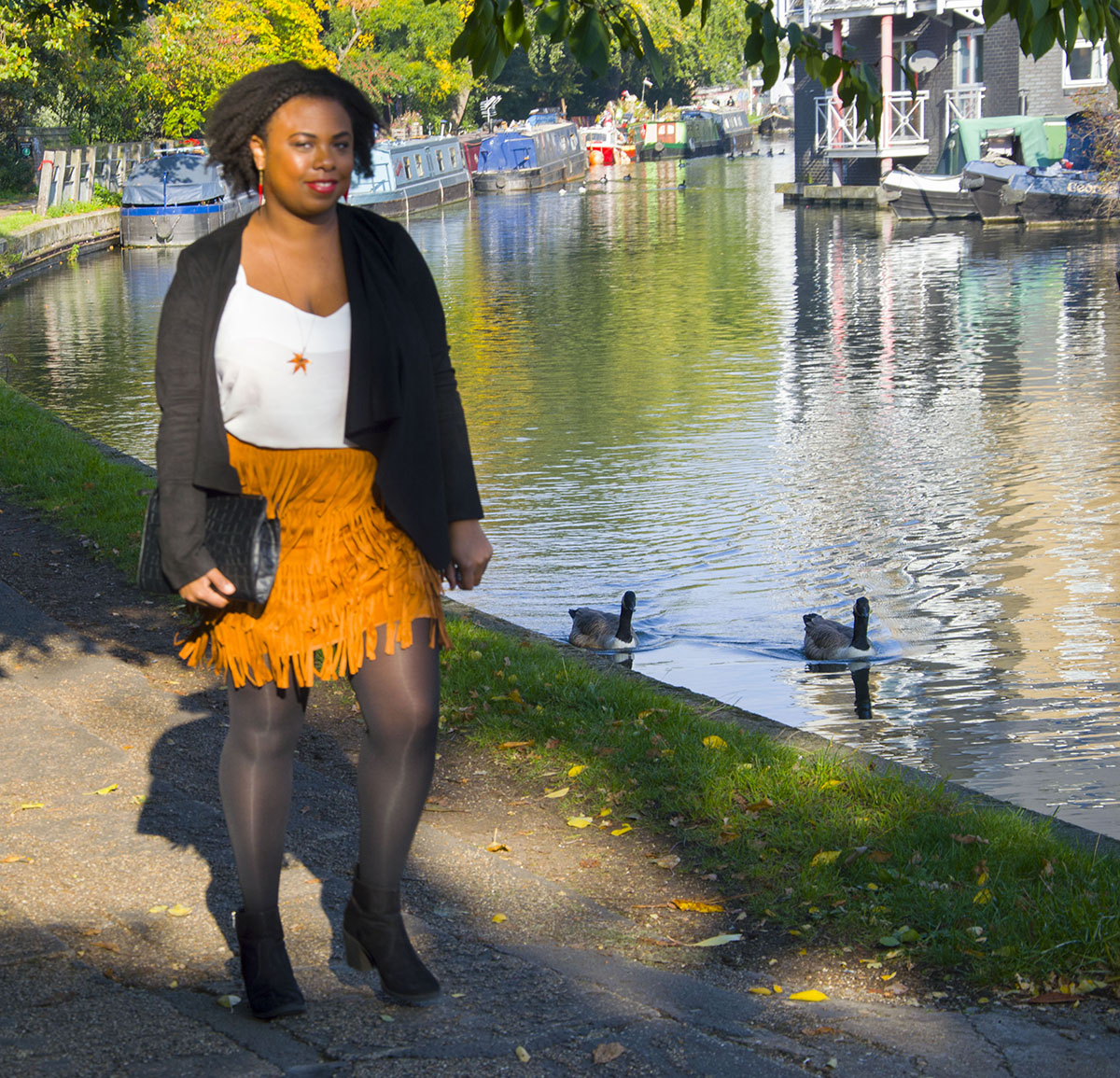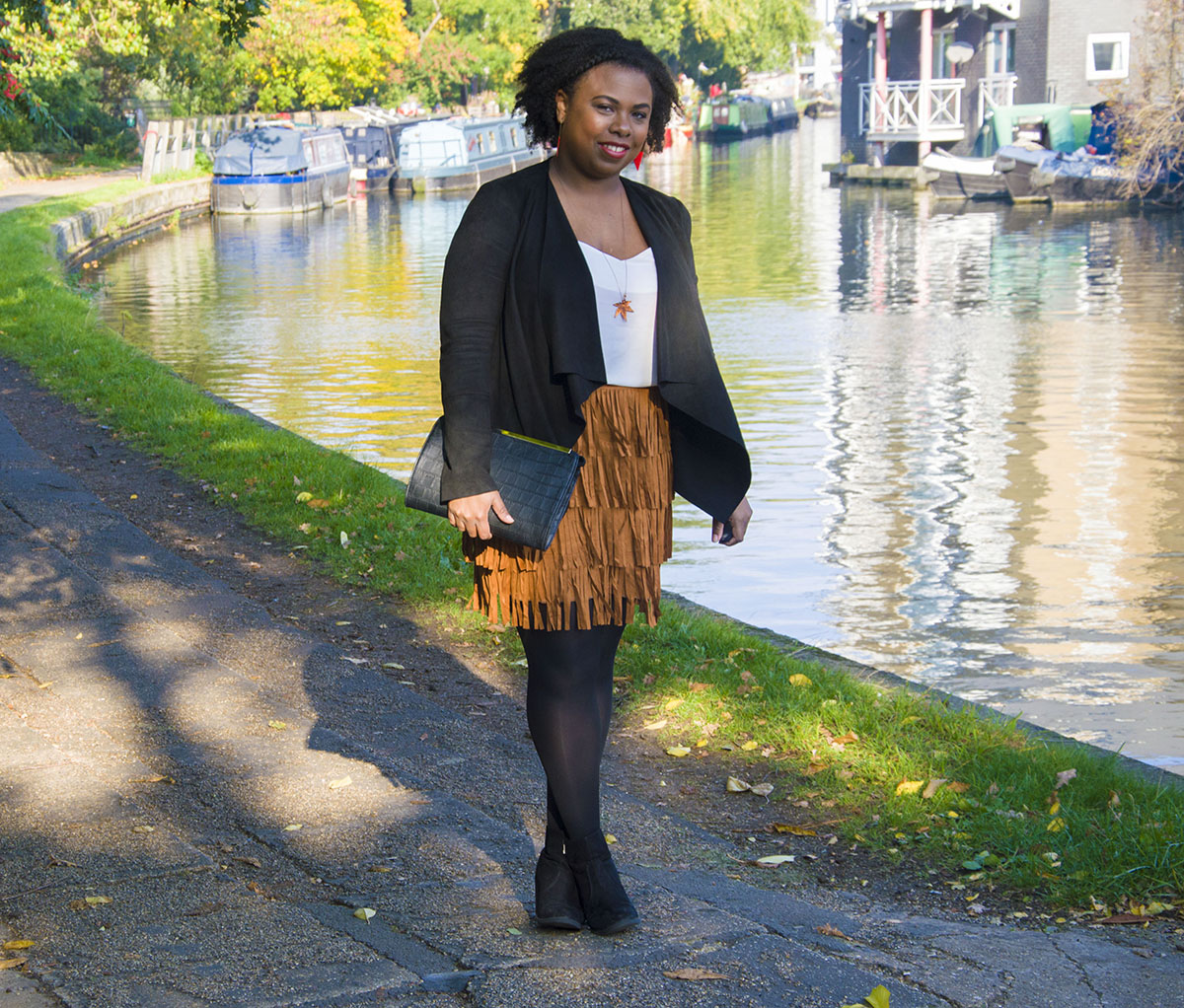La tenue /Outfit: Veste noire en suèdine noire / Black suede jacket Pimkie, Camesole blanche / White cami top – Asos, Jupe Camel à franges / Fringed Camel Skirt – ‘Fashion Union‘ Asos, Bottine / Boots(old) – H&M, Boucles d’oreilles / Earrings – H&M en magasin uniquement/ in shop only, Colliers / Spitafield market.