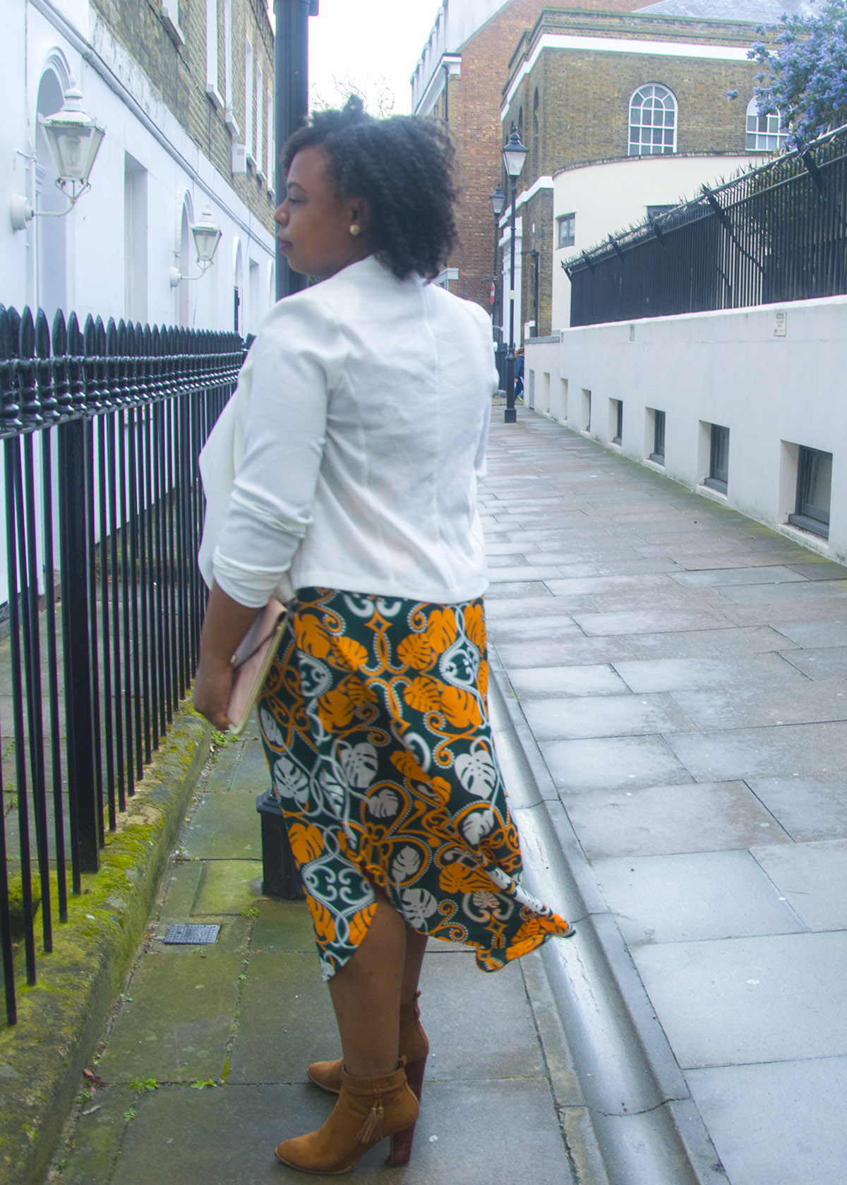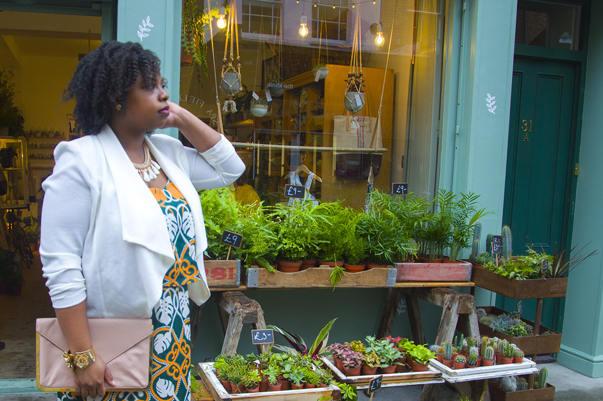 I went to  Farringdon with my friend Mary to shoot. Farringdon is a great area with lot of cure bars and restaurants. We had no luck that day sun was not up. But, we did not give up and went outside anyway! I am wearing a dress from H&M. H&M is my crib this time around. I really like this pattern. It is so 70’s. The cami kinda top of the dress gives a great clivage.  I am also wearing a jacket from Primark. I like the flowiness of this outfit nothing really tight. To add a folk touch to the outfit, I wore my camel boots and this bohemian influenced necklace. I am really fond of cuffs everytime I see one in stores I feel like buying it. This one was bought during sale in H&M. I really like because of the colour, the simplicity of the design and the two camellia flowers.