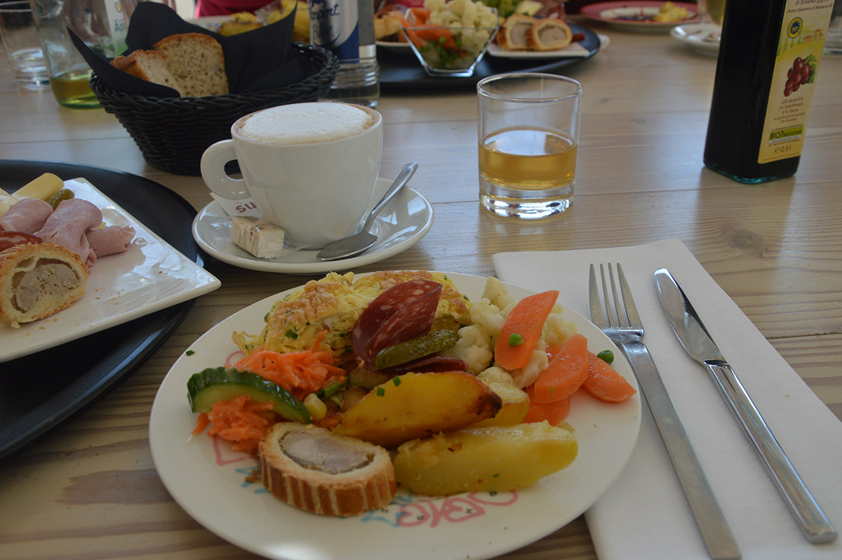 Le lendemain matin, nous sommes allée au Mudam (Musee d’arts modernes) pour un brunch. Le musée se trouve dans le quartier européen du Luxembourg. Il est un peu excentré mais sachez que les bus sont gratuits le week end! wouhou! L’architecture des immeubles y est singulière et imposantes. La commission européenne n’est pas trop loin. Mais soyons sérieux, c’est un peu un quartier fantôme le week end du moins. Le restaurant se trouve à l’intérieur du centre. L’ambiance calme et reposante m’a beaucoup plu. Le menu est organique. J’ai opté pour un brunch complet et à volonté pour 21 euros. Il comprenait une boisson chaude, des crudités, des légumes, du fromage, de la charcuterie, des oeufs, un yaourt et un fruit… un déjeuner de competition! J’ai A D O R É!