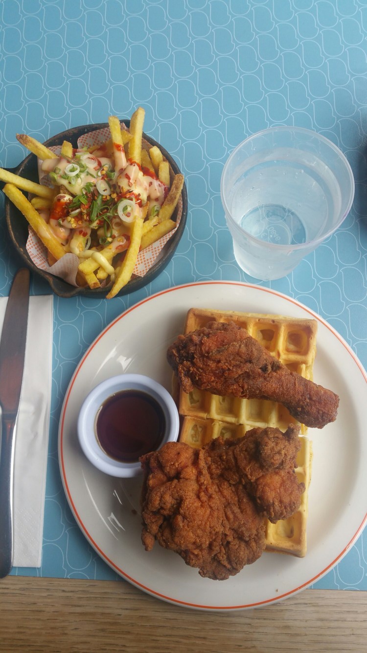 Bird est une chaîne de restaurants qui propose des plats à base de poulets élevés en plein air. Bon, je pense qu’il y a un peu de Green Washing… Elevé en plein air ne signifie pas bio -_-‘. Parmi les plats de la carte, il y a une spécialité composée de poulets frits et de gauffres. C’est un plat soul food connus. La Soul food est une cuisine afro américaine. Je m’étais dit qu’un matin à l’heure du Brunch, j’irai au restaurant pour le tester. Et bien, c’est maintenant chose faite. Un délice! Le poulet est servis sur deux énormes gauffres et du sirop d’érable. Le poulet était parfaitement cuit. Il n’était pas sec pour autant. À ma grande surprise, le sirop d’érable marche bien avec le poulet frit. Mais, j’en ai gardé la majeure partie pour les gaufres… Miam! J’ai commandé des frites avec une sauce aux influences coréennes. C’est assez pimenté mais j’ai beaucoup aimé. Un bémol, le restaurant charge des frais de service d’office. Je déteste quand les resto applique cette pratique. Je ne suis pas libre de décider si le serveur mérite son pourboire ou non. Je ne suis pas sûre que le staff récupère ces sous en vrai.