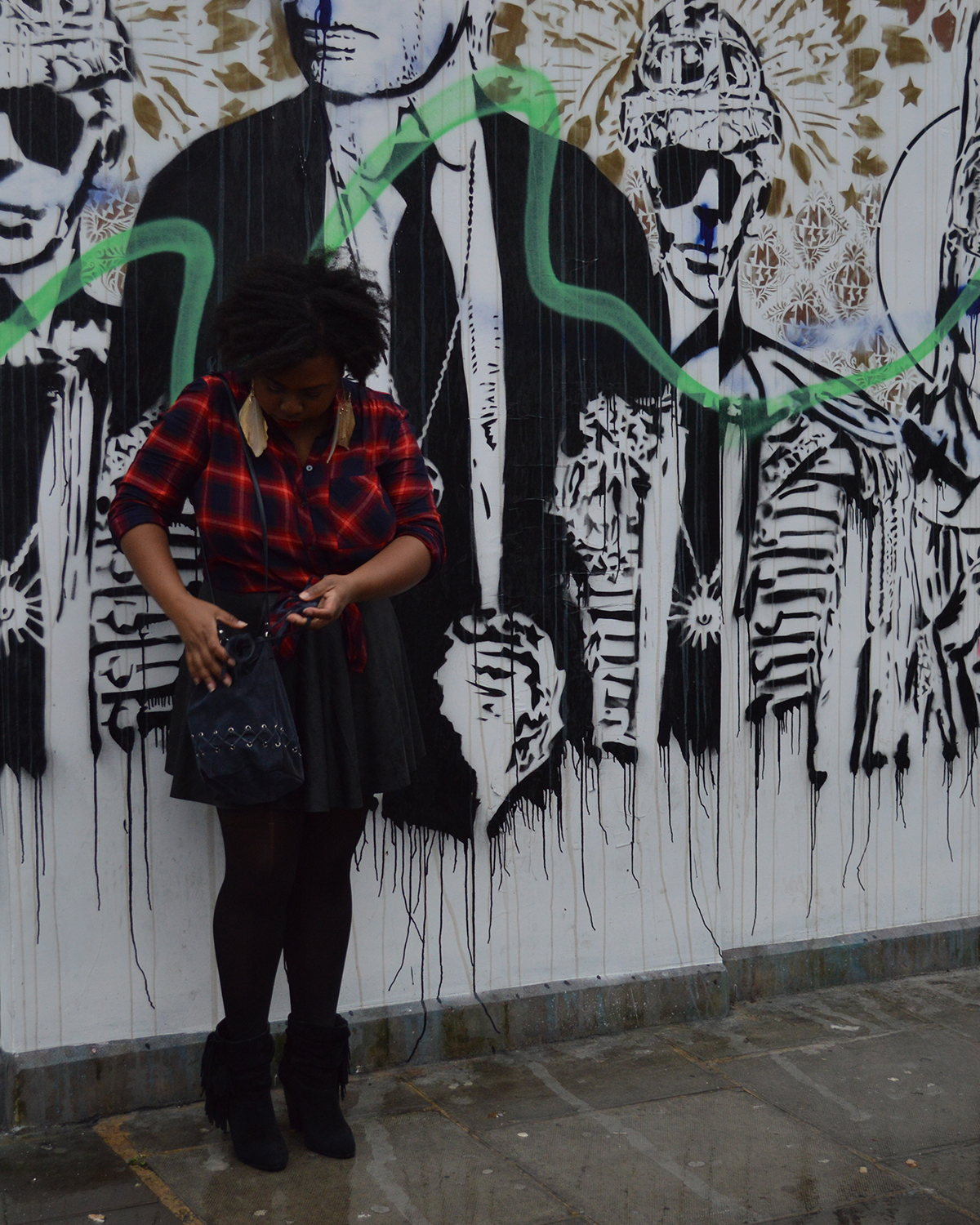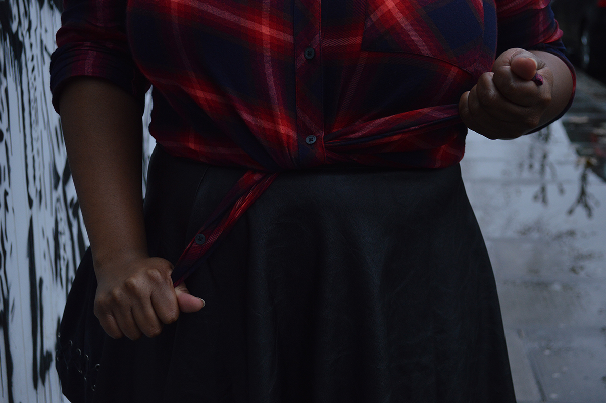 Ma tenue: Chemise à carreaux – Gap, Jupe simili cuir – New Look (old), Bottines à franges noires – Parfois (old), Boucles d’oreilles attrape-rêve – H&M, Sac – New Look (old), Legging noir – H&M (old)