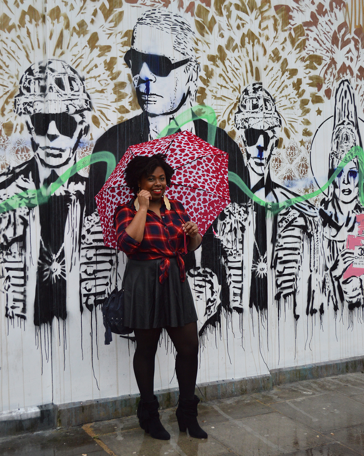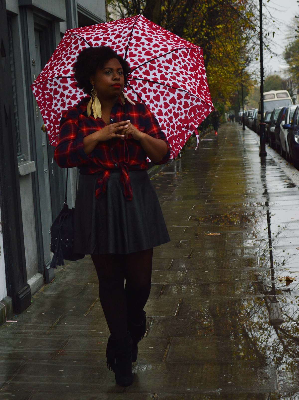 J’aime beaucoup le mix des coeurs du parapluie et des carreaux de ta chemise :p et le lieu est super bien trouvé 😉