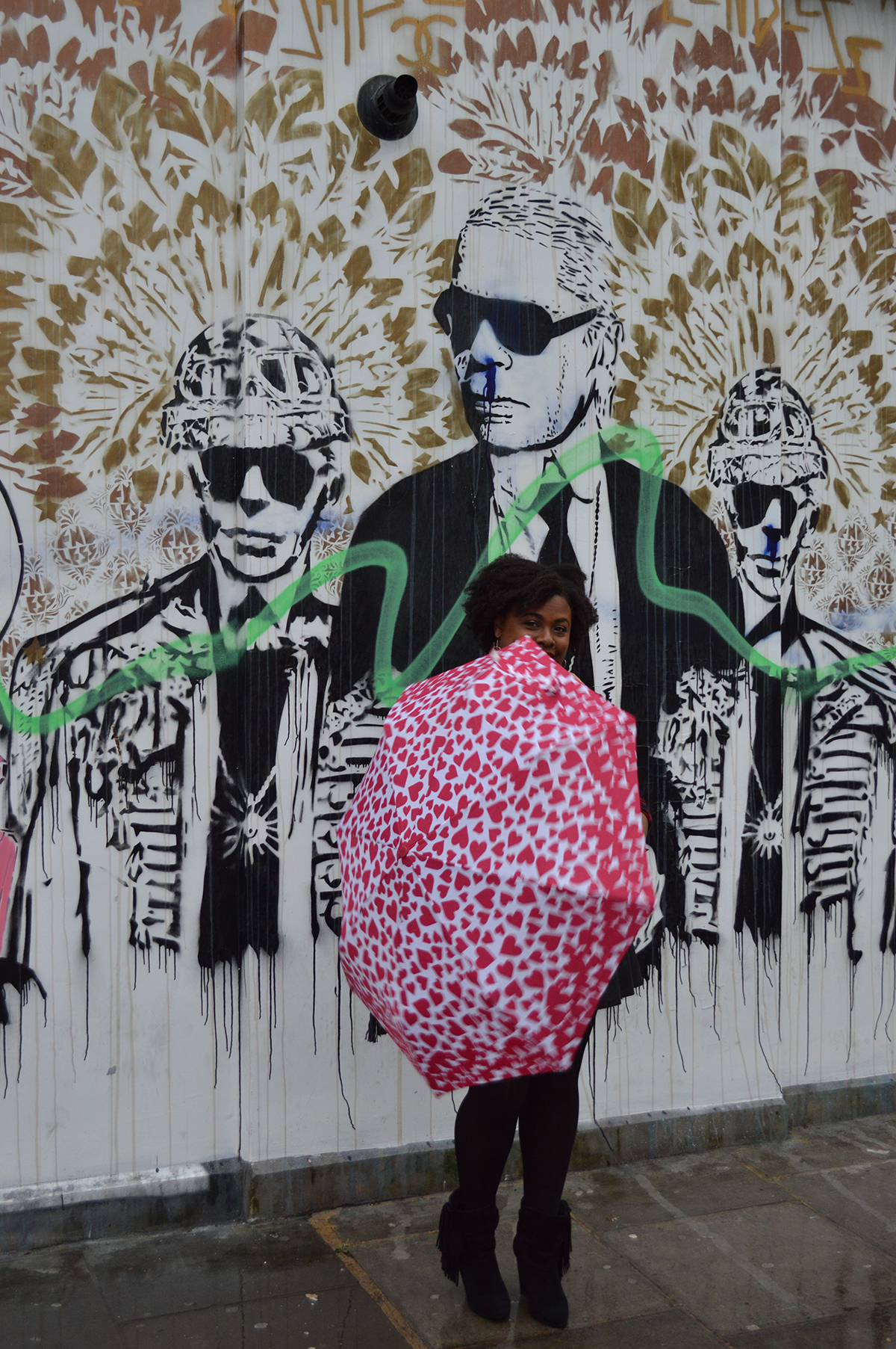 Nous avons pris les photos lors d’une balade à Portobello, le quartier des antiquaires. J’aime beaucoup ce quartier de Londres même si il est très prisé. Pour la petite histoire, le jour où on a planifié de faire les photos, il a plu comme vache qui pisse. Le lendemain quand je n’avais plus de look à shooter, gros soleil!… un classique dans le blogging ahah! Ma photographe du jour ne s’en ai très bien sorti. Merci a Clio qui a bien voulu me prendre en photo aidée de son « assistant ». Du coup, les photos ont eu lieu sous la pluie mais avec un parapluie acheté dans un magasin outlet de chez Esprit. Je ne suis pas fleur bleue pour un sous mais le motifs coeurs m’a séduit.