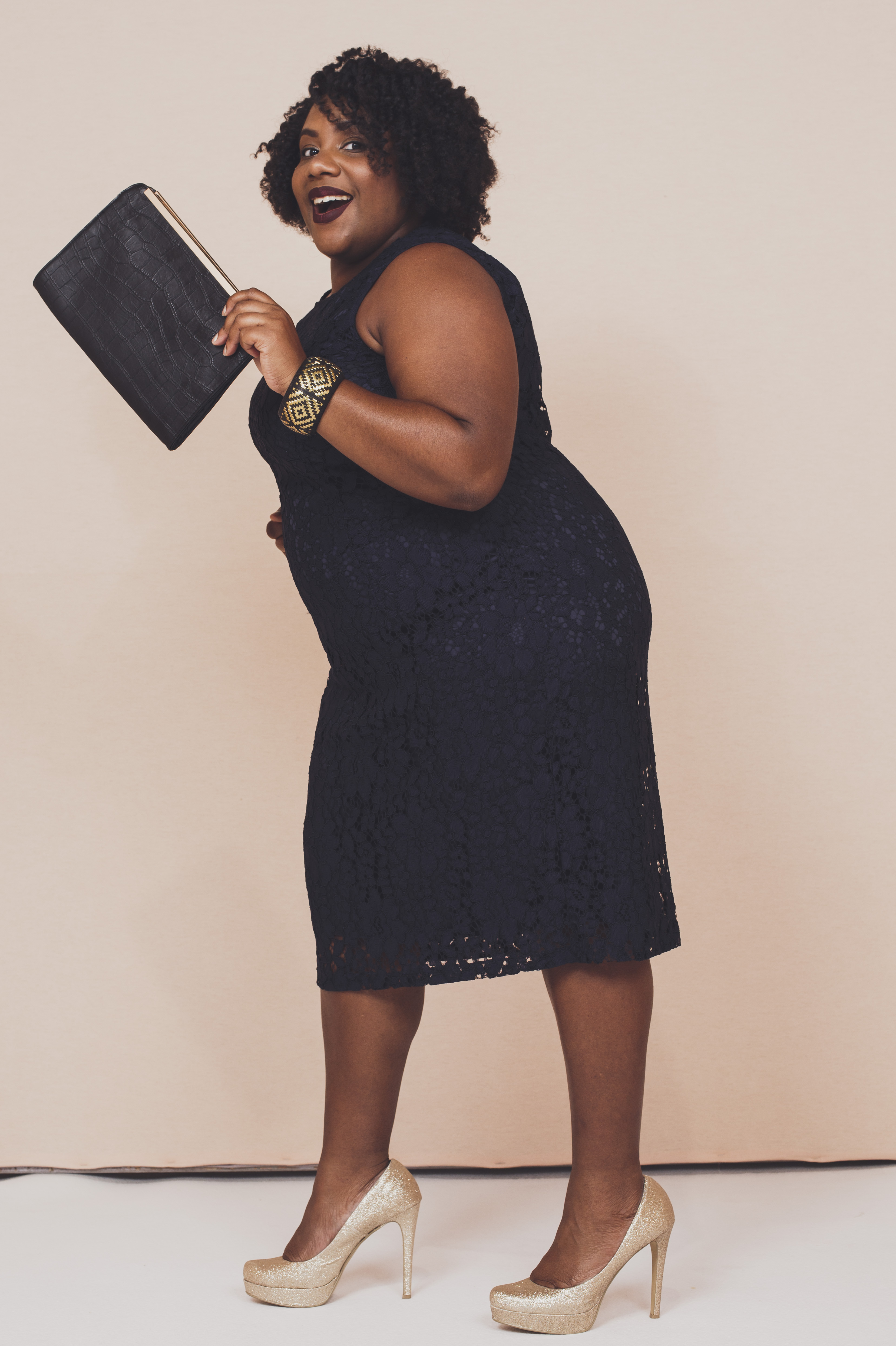 Le look de Gwladys: Robe en dentelle bleu marine – Persona par Marina Rinaldi, Bracelet – Promod, Escarpins – Chinese Laundry, Pochettes – Primark