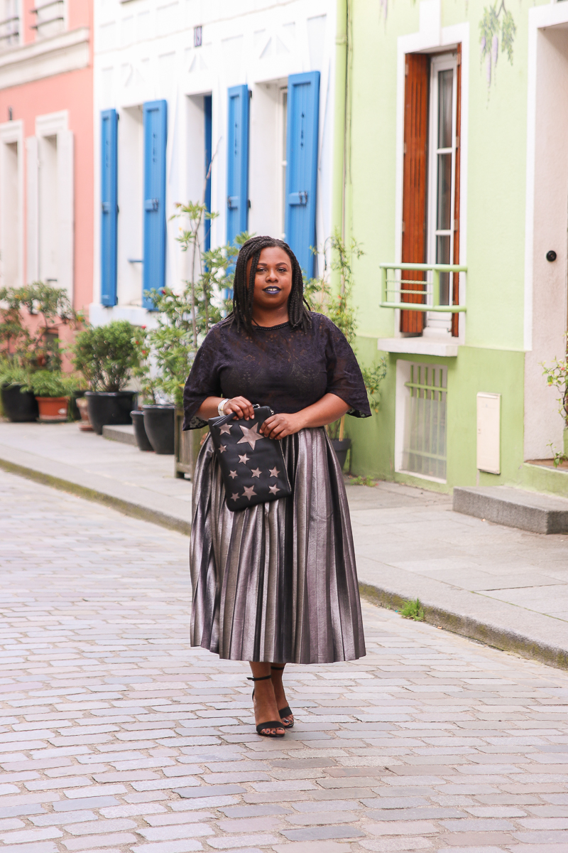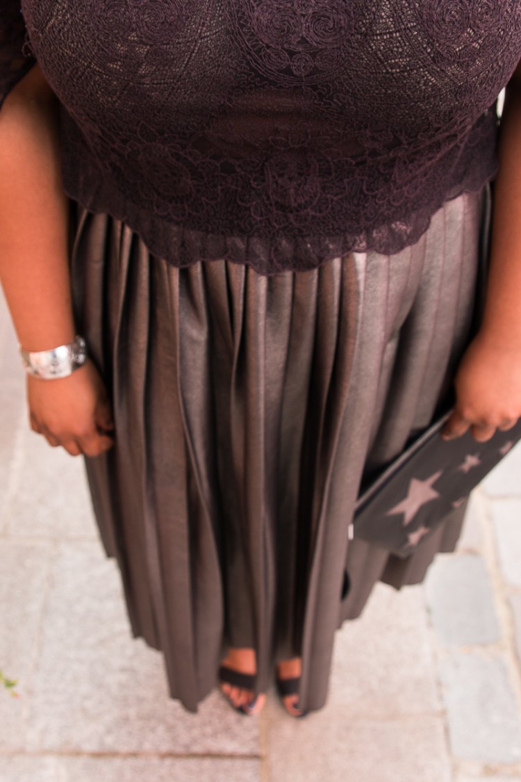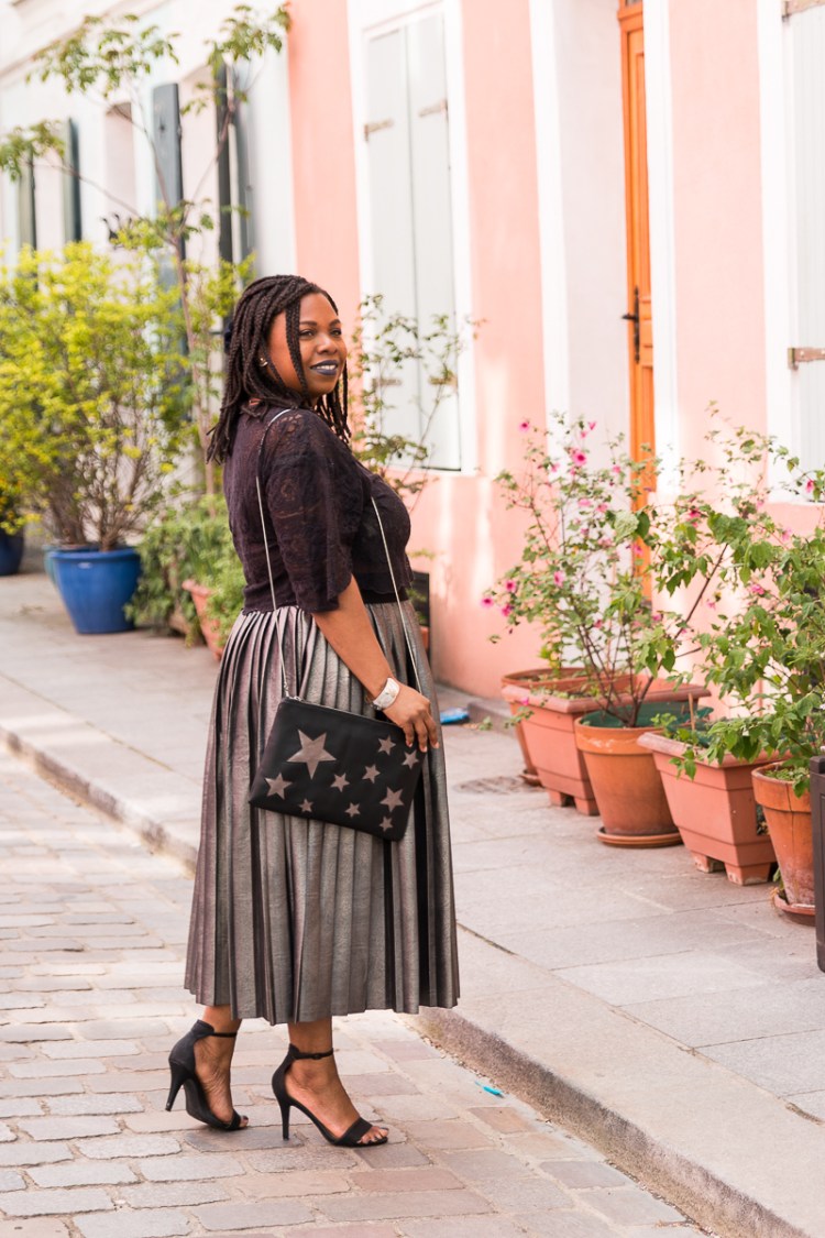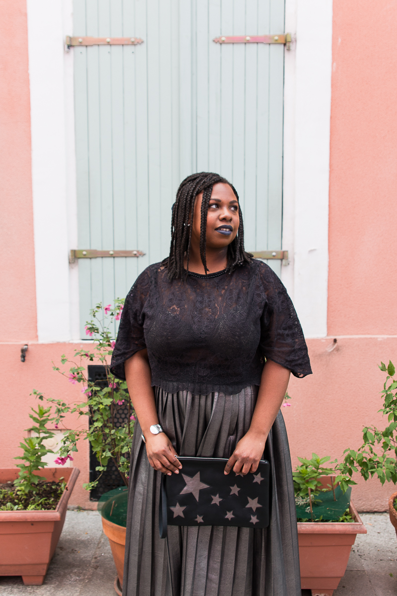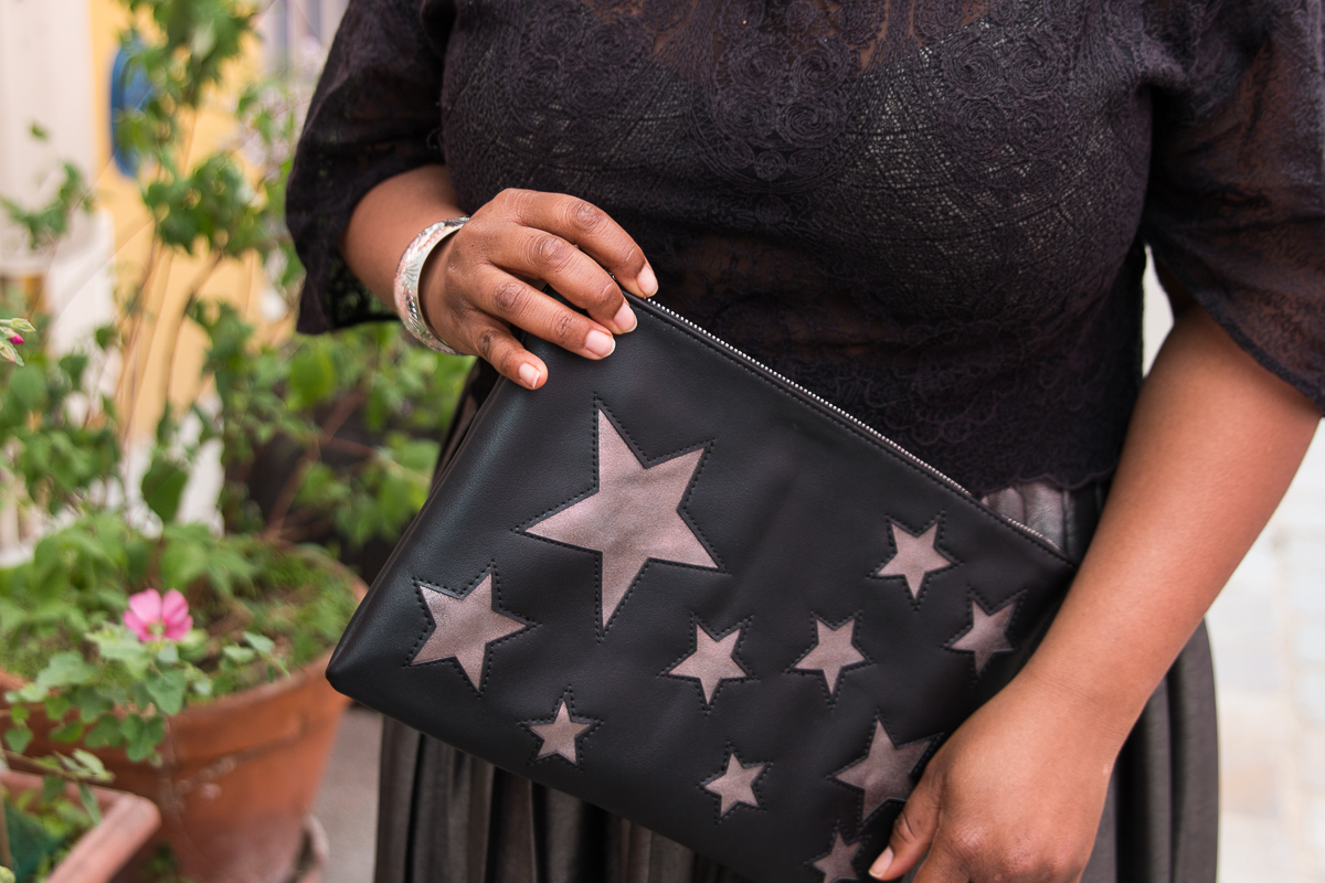 On m’a inculqué quelques règles pour une tenue de mariage: pas de blanc on ne vole pas la vedette à la mariée, pas de noir on ne se rend pas à enterrement. Qu’est-ce qu’on dit déjà? Les règles sont faites pour être enfreintes! ahah. Pour une tenue de soirée, j’ose le noir dans mon look. Il y a quasiment rien de nouveau dans ce look. J’ai associé deux de mes pièces favorites . Je porte un crop top en dentelle de chez Zara. J’adore ce haut! La dentelle laisse voir la lingerie. Il est sexy sans être décolleté. La jupe plissée est mon tout premier achat Elvi clothing. J’adore la texture effet cirée. La coupe est top. La ceinture est un élastique ce qui la rend très agréable à porter. Je suis fan du mouvement qu’elle crée quand je marche. Elle fait toujours son effet pour moi. Autre coup de coeur: la pochette achetée en solde chez Pimkie (ici, mais pas en solde sur le site). Une vrai aubaine! Le motif étoile me fait kiffer. Elle est belle et suffisamment grande pour pouvoir mettre les essentiels. Je peux la porter en pochette ou en bandoulière. Les boucles d’oreille et le bracelet viennent de chez Iam. Les boucles d’oreilles soulignent parfaite les lobes des oreilles. J’étais un peu circonspecte sur la manière de les porter mais j’ai finis par adopter le style. J’aime beaucoup la touche delicate qu’elles apportent. Je me rends compte qu’elles sont si discrètes qu’on les voit à peine sur les photos. J’ai acheté les sandales chez New look. A l’époque, l’enseigne proposait beaucoup de sandales à talon et dans toutes les couleurs.