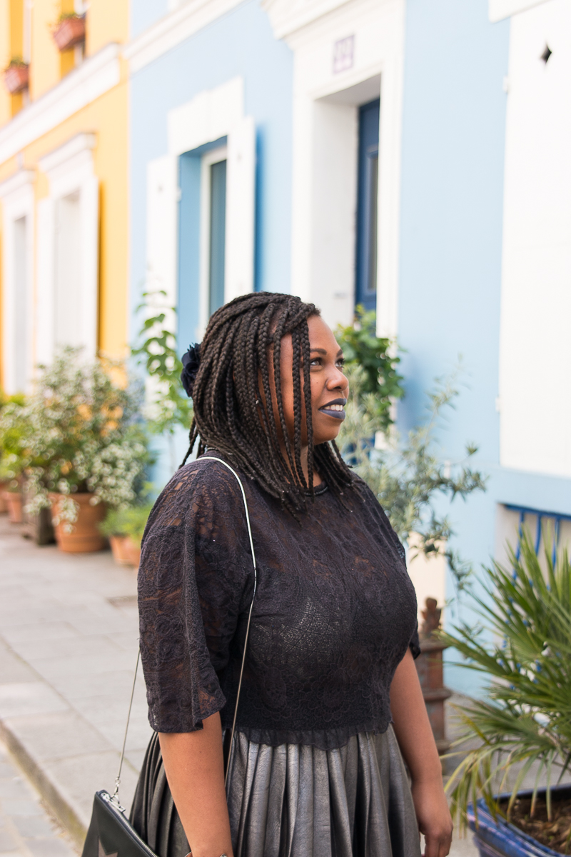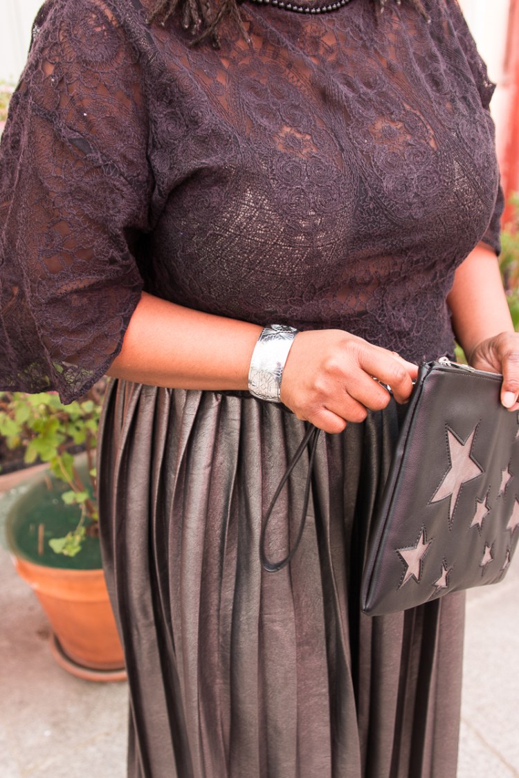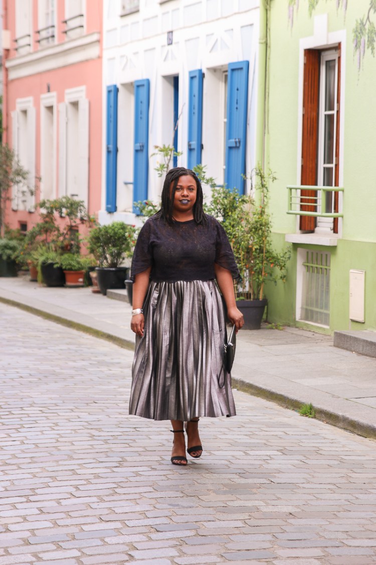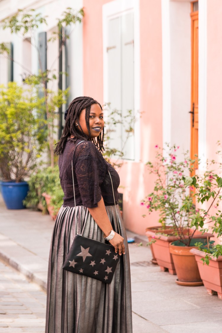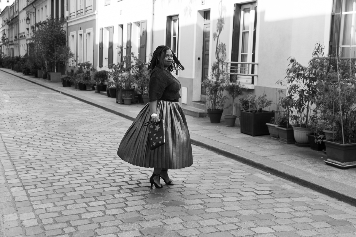 On m’a inculqué quelques règles pour une tenue de mariage: pas de blanc on ne vole pas la vedette à la mariée, pas de noir on ne se rend pas à enterrement. Qu’est-ce qu’on dit déjà? Les règles sont faites pour être enfreintes! ahah. Pour une tenue de soirée, j’ose le noir dans mon look. Il y a quasiment rien de nouveau dans ce look. J’ai associé deux de mes pièces favorites . Je porte un crop top en dentelle de chez Zara. J’adore ce haut! La dentelle laisse voir la lingerie. Il est sexy sans être décolleté. La jupe plissée est mon tout premier achat Elvi clothing. J’adore la texture effet cirée. La coupe est top. La ceinture est un élastique ce qui la rend très agréable à porter. Je suis fan du mouvement qu’elle crée quand je marche. Elle fait toujours son effet pour moi. Autre coup de coeur: la pochette achetée en solde chez Pimkie (ici, mais pas en solde sur le site). Une vrai aubaine! Le motif étoile me fait kiffer. Elle est belle et suffisamment grande pour pouvoir mettre les essentiels. Je peux la porter en pochette ou en bandoulière. Les boucles d’oreille et le bracelet viennent de chez Iam. Les boucles d’oreilles soulignent parfaite les lobes des oreilles. J’étais un peu circonspecte sur la manière de les porter mais j’ai finis par adopter le style. J’aime beaucoup la touche delicate qu’elles apportent. Je me rends compte qu’elles sont si discrètes qu’on les voit à peine sur les photos. J’ai acheté les sandales chez New look. A l’époque, l’enseigne proposait beaucoup de sandales à talon et dans toutes les couleurs.