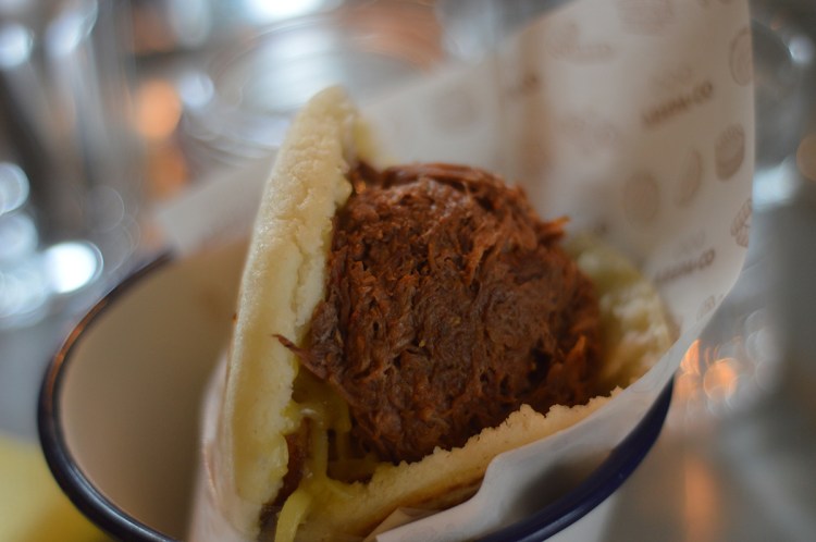 J’ai opté pour l’arepa Pabellón. Il contient de la viande de boeuf emincée, du cheddar rappé, des haricots noirs et des plantains. Le pain est moelleux et ne laisse pas de sensation de gras. La viande est légèrement épicée mais pas super piquante. C’est un sandwich très consistant. Je serais incapable de vous dire si les saveurs et les textures sont fidèles aux plats vénézuéliens mais j’ai l’impression qu’ils n’en sont pas loin!