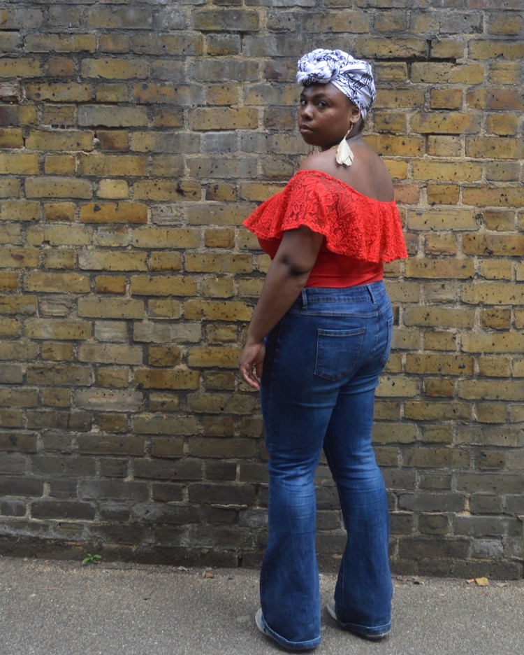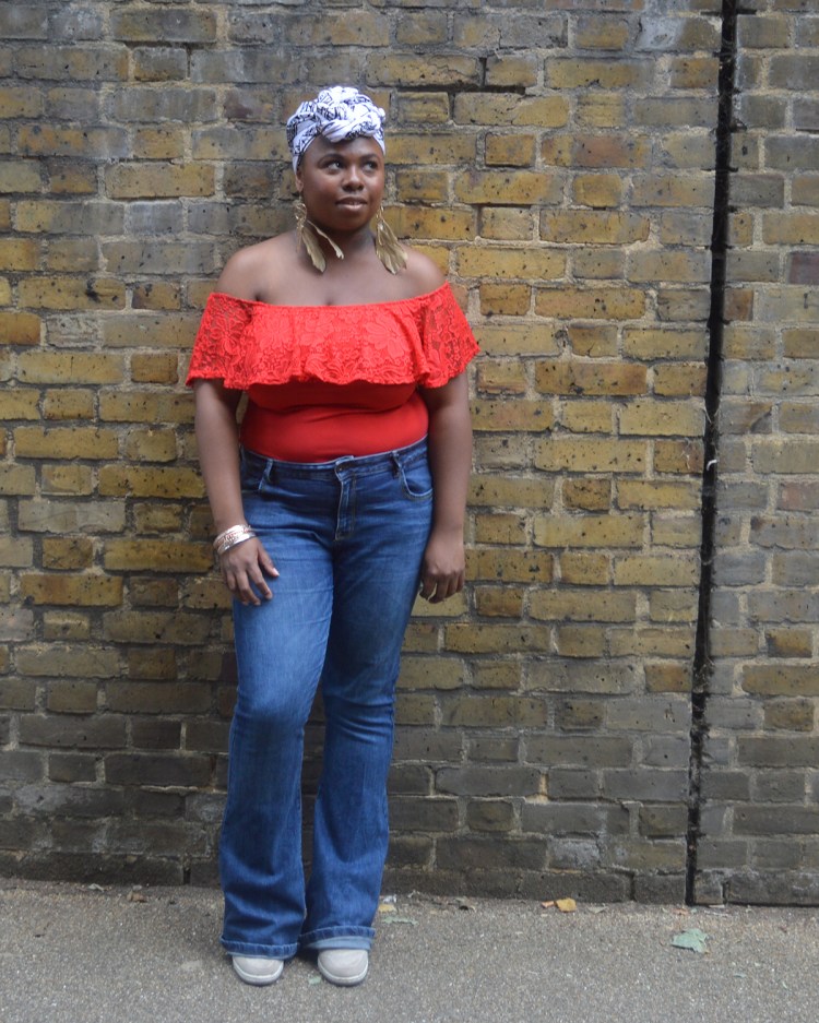 En. The outfit. For the blue, I wear Flare jeans from Primark. He’s almost two years old. It is still in very good condition. The fabric is thick but elastic. It is slightly aged. I am great at ease in it. For red, I handed over my body bought on the site of Asos. I like having naked shoulders. It is an unusual sensation for me but I am quick! The earrings are a find made to H & M. I love them but they are fragile. I’ve already lost a pen on one of the pendants so I keep them for a good occasion. The white is represented by this scarf on the booth of a designer. Unfortunately, I do not remember his name at all. But the tissue is called Bazin. I had been looking for a long, uncolored scarf. I find it too cool! Tell me if you want a tutorial on this scarf tie. We do not see much but I wear Nike compensated. They are hidden by jeans. In the end, my look is a mix of 70s style, ethnic and bohemian. Ah ah.