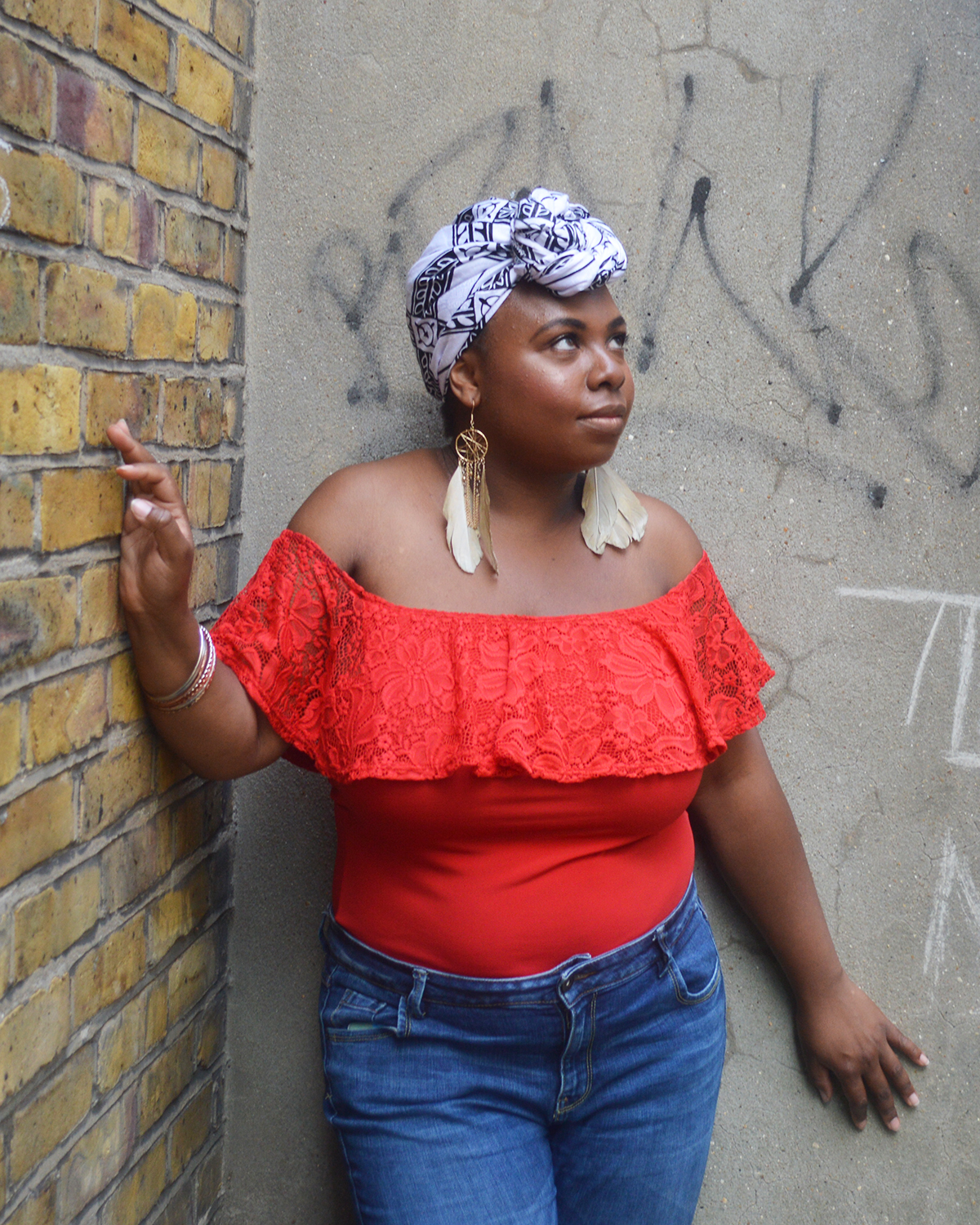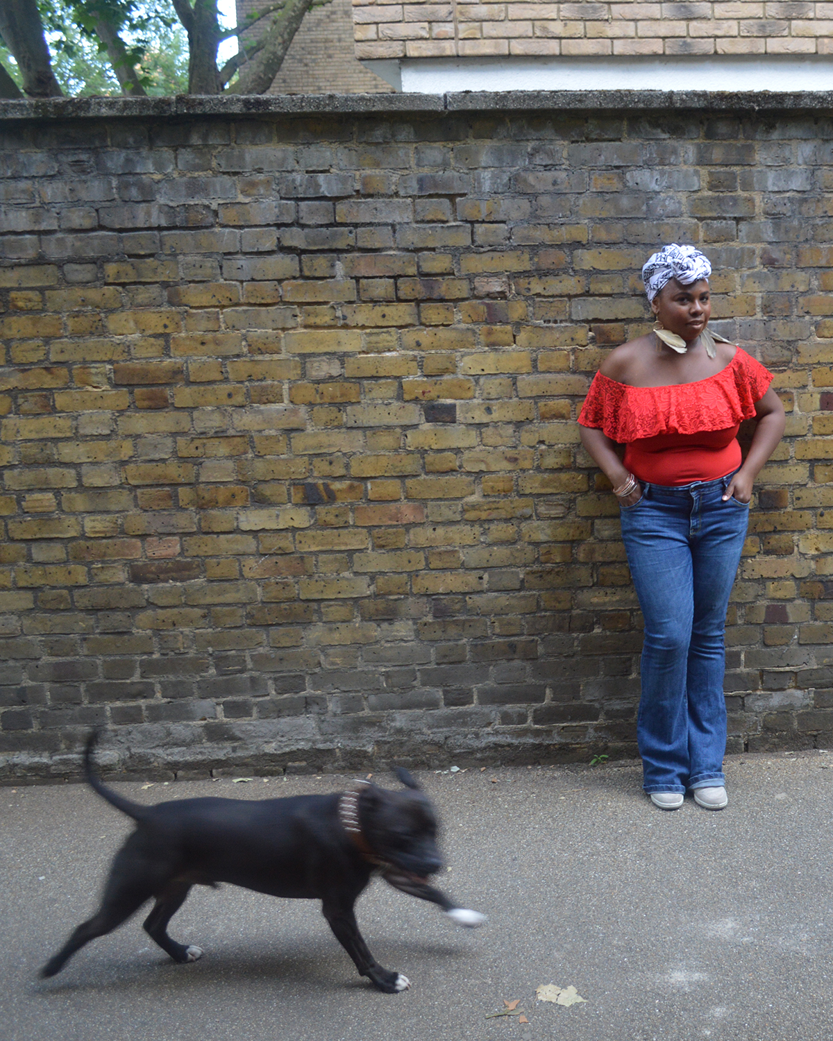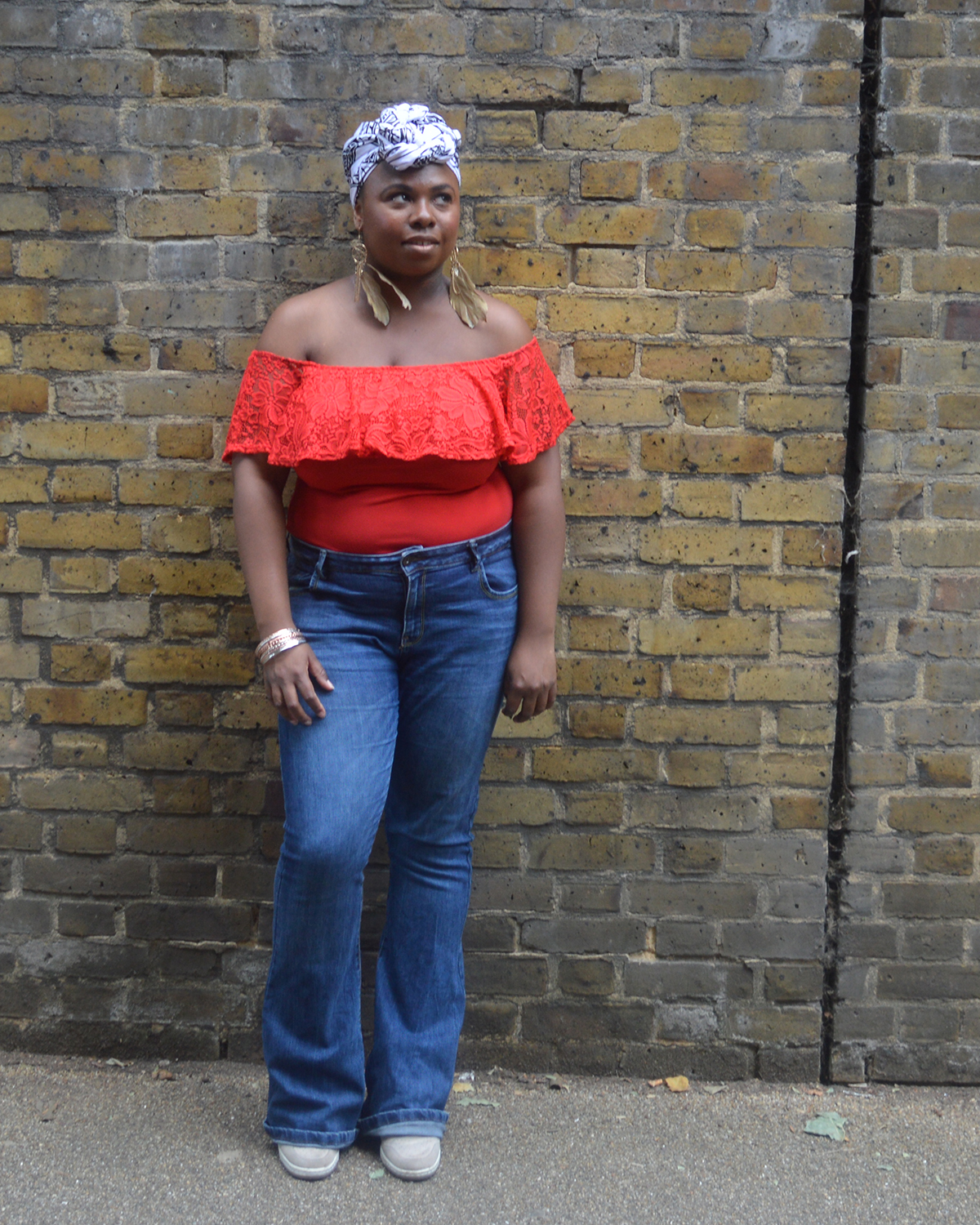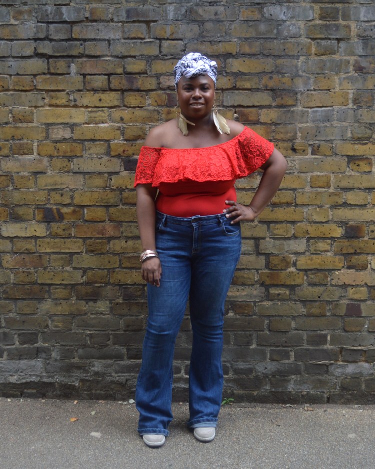 La tenue. Pour le bleu, je porte un jean Flare de chez Primark. Il a presque deux ans. Il est encore en très bonne état. Le tissus est épais mais élastique. Il est légèrement vieilli. Je suis super à l’aise dedans. Pour le rouge, j’ai remis mon body acheté sur le site d’Asos. J’aime avoir les épaules nues. C’est une sensation inhabituelle pour moi mais je m’y fais vite! Les boucles d’oreille sont une trouvaille faite à H&M. Je les adore mais elles sont fragiles. J’ai déjà perdu une plume sur l’un des pendants donc je les garde pour une bonne occasion. Le blanc est représenter par ce foulard chiné sur le stand d’une créatrice. Malheureusement, je ne me rappelle plus du tout de son nom. Mais le tissus s’appelle Bazin. Je cherchais depuis longtemps un foulard non coloré. Je le trouve trop cool! Dis moi si tu veux un tuto sur cette attaché de foulard. On ne les voit pas beaucoup mais je porte des Nike compensées. Elles sont cachées par le jean. Au final, mon look est un mix d’influences 70s, ethniques et bohémiennes. Ahah.