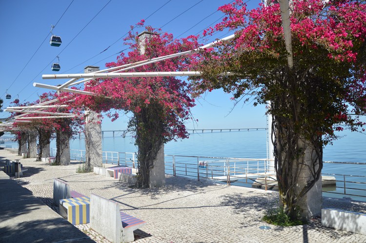Puis, j’ai pris un bus direction le LX factory. C’est une ancienne zone industrielle réhabilitée. Le LX factory se trouve au pied du pont Vasco de Gama. Il regroupe des restaurants, des bars, des concepts stores, un libraire, des créateurs. Les herbes grimpantes se juxtaposent avec du Street art. Allez faire un tour dans l’une des toilettes gratuites. Elles sont hyper bien décorées! J’ai beaucoup aimé le lieu. Le dernier jour, j’ai eu juste une flemme titanesque de marcher alors j’ai pris le funiculaire juste pour le plaisir d’être tractée. Ahaha! Je n’ai pas pris la ligne 28 qui très voire trop connue. J’ai pris la ligne 12E qui suit pratiquement le même chemin. Puis, je suis allée voir la fameuse place du commerce dans Baixa. J’étais curieuse de visiter le Parque das Naçoes. Ce quartier très moderne a été construit pour l’exposition universelle de 1998. Les infrastructures construites à l’occasion sont des hommages à Vasco de Gama. Pour accéder au parc, tu dois traverser le Centre commercial. La station de train annonce vite la couleurs avec une architecture travaillé. Il tranche complètement avec le centre ville. Si tu veux t’éloigner des endroits bondées c’est l’endroit parfait en tout cas en semaine. Je n’ai pu passer qu’une petite heure sur place. Je finis par me poser sur l’allée principale pour me perdre dans mes pensée face au Tage . Le Pont Vasco de Gama démarre du parc et traverse le Tage sur 17 km.
