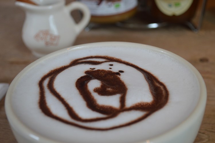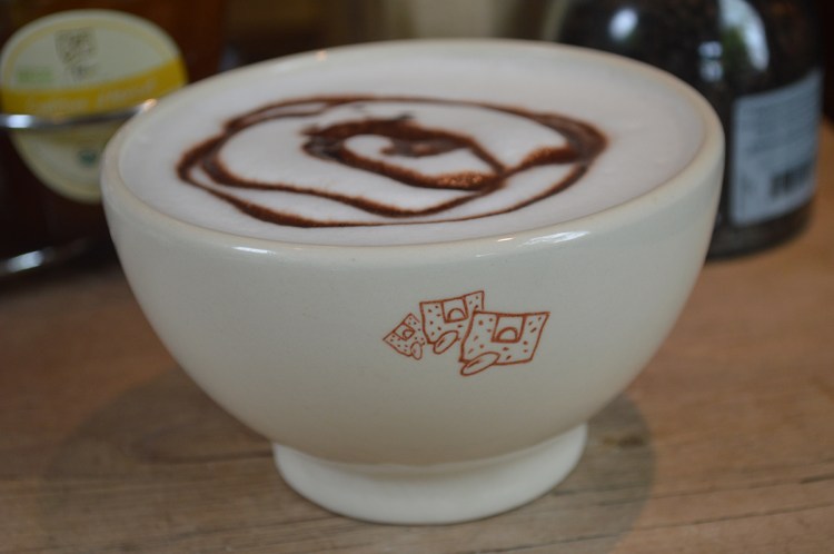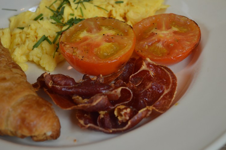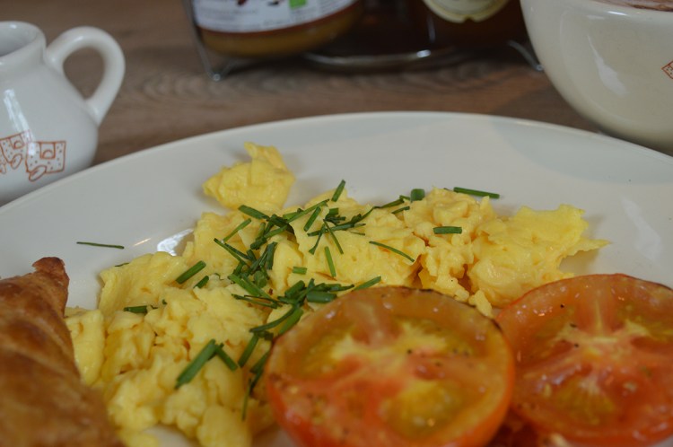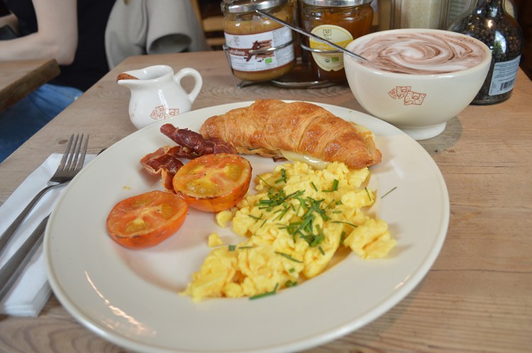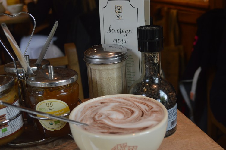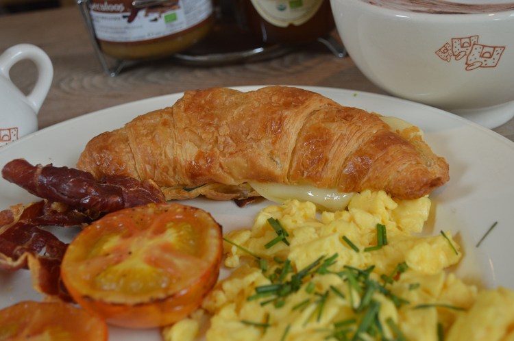 J’ai opté pour le petit déjeuner « Boulanger », une assiette qui comprend normalement un scone au cheddar, des oeufs brouillés, du prosciutto croquant et tomates cuites au four. Malheureusement, plus de scones ce jour là! argh! j’adore les scones au fromage. Ils l’ont remplacé avec un croissant jambon fromage. J’ai aussi commandé un large bol de chocolat chaud. La particularité est que le chocolat est fondu et versé dans un petit pot. C’est ensuite à toi de le verser dans le lait. Ainsi, tu peux choisir l’intensité de ton chocolat chaud. J’ai un peu craqué sur le pot de pâte à spéculos posé sur ma table avec d’autres condiments. C’est la marque du Pain Quotidien. Sur chaque table, ils mettent à disposition des confitures organiques à déguster seul ou sur une tranche de pain.