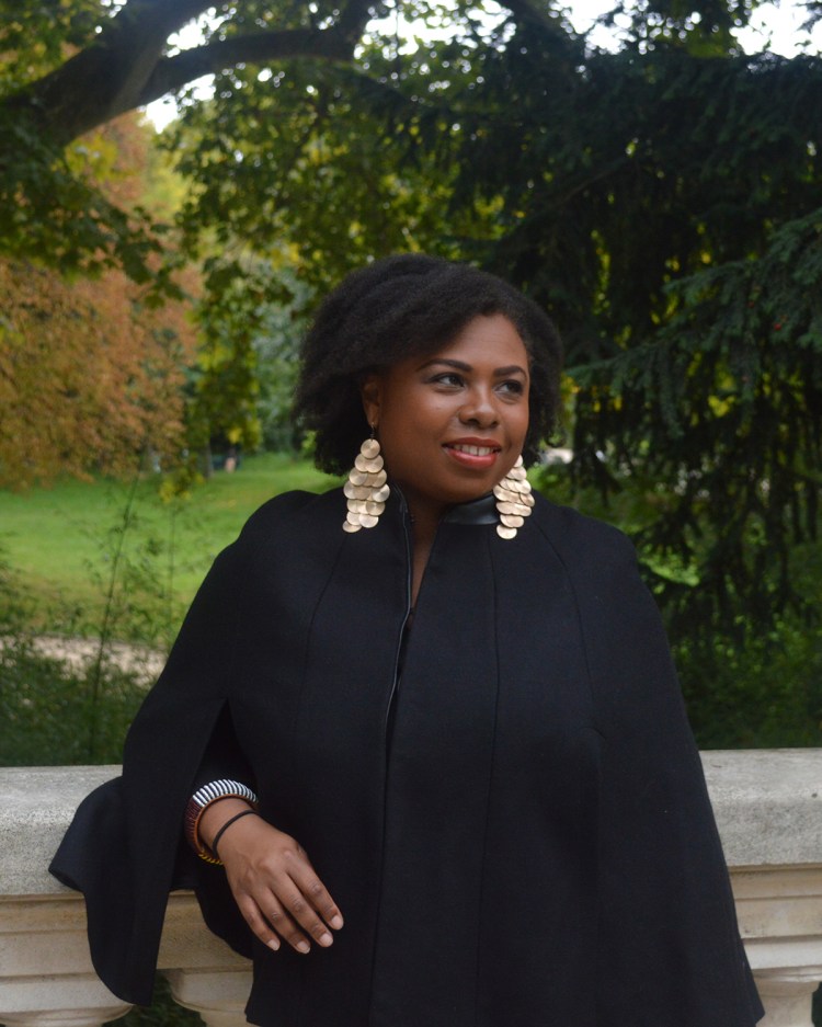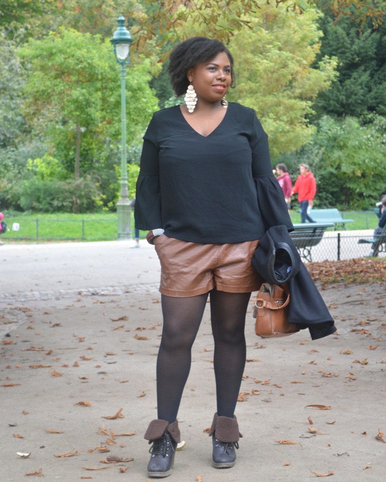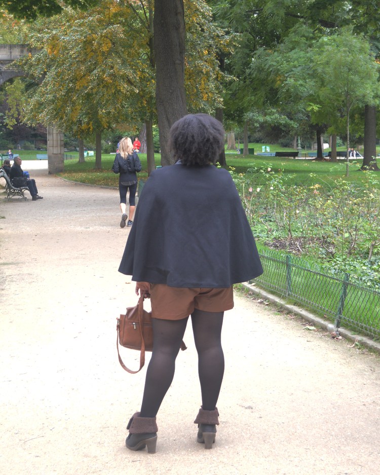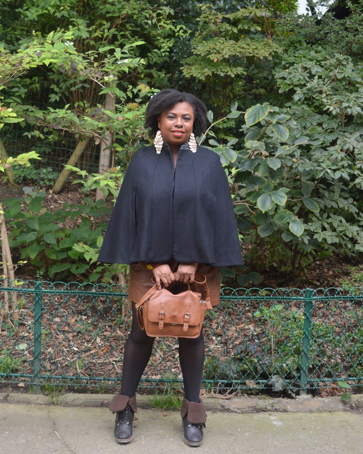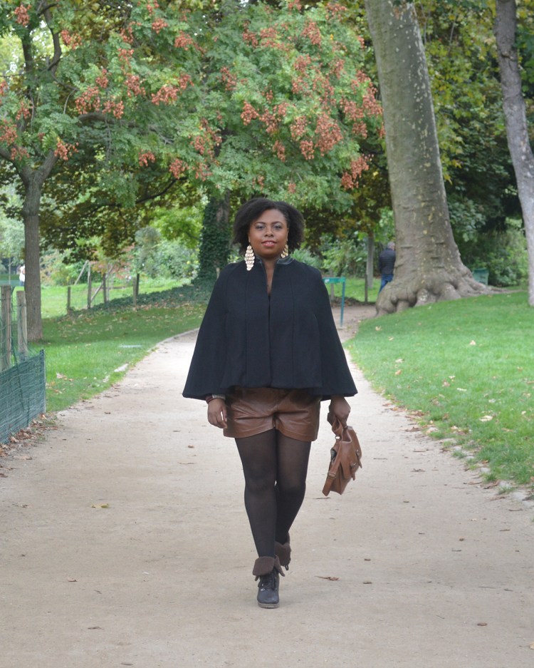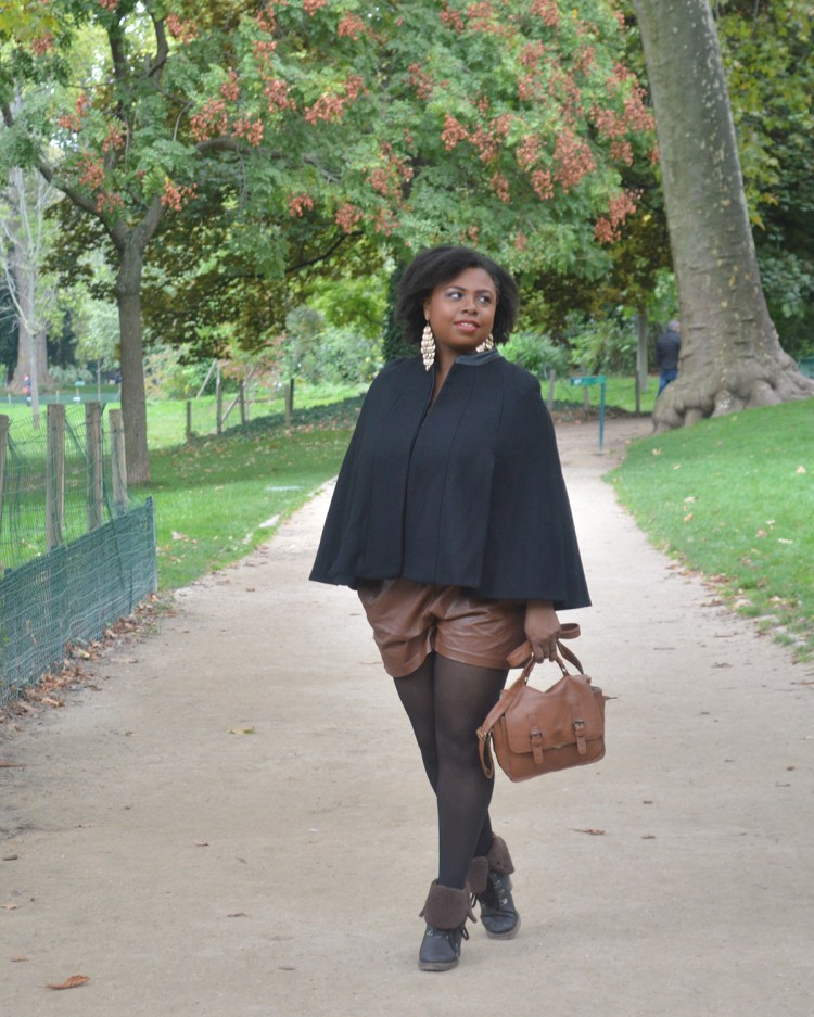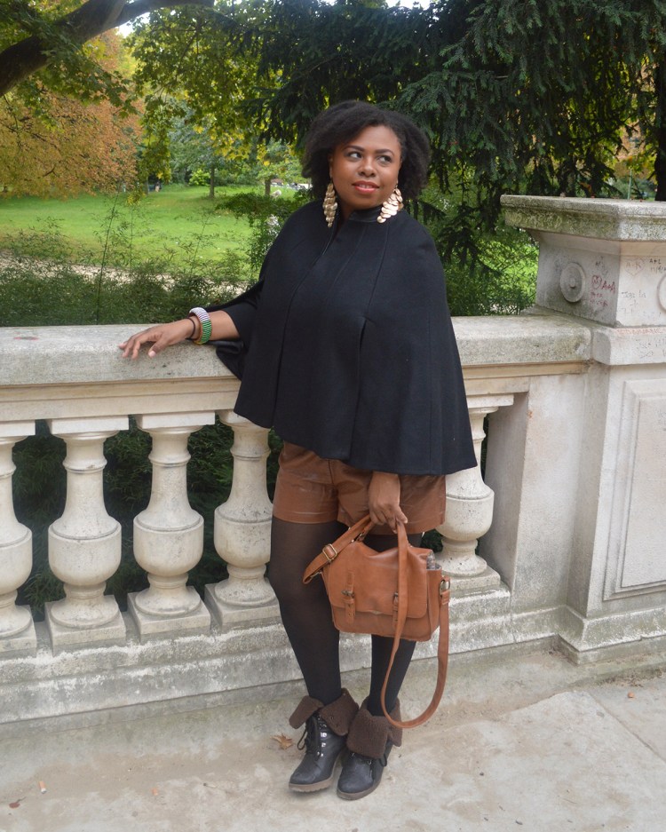 Ma tenue: Manteau Cape – Zara, Top – H&M ici, Short en simi cuir – H&M, Bottines – André, Boucles d’oreilles – H&M, Sac – Camaïeu.
