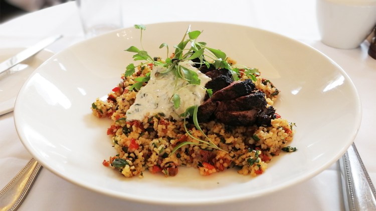 L’ offre comprenait une entrée, un plat, un dessert. Je n’ai pas été limité dans le choix des plats. J’ai pu choisir des plats en dehors de la formule de midi. En entrée, j’ai pris une mousse de crabe. En plat de resistence, j’ai opté pour de l’agneau sur un lit de boulghour façon taboulé. Le tout était accompagné d’une sauce qui rappelait le tsaziki. Les saveurs orientales étaient au rendez-vous! L’agneau était cuit à la perfection. J’ai pris mon temps pour manger ma dernière bouchée! Je me suis régalée. Jai rarement eu l’occasion de manger des plats aussi bien présentés. En desert, j’ai pris une glace chocolat/ vanille avec des brownies des morceaux de brownies au chocolat. Wouahouh, je m’attendais à quelque chose d’aussi énorme! Ça ne se voit pas dans mes photos mais la coupe faisait 15 cm. Je n’ai pas pu finir.