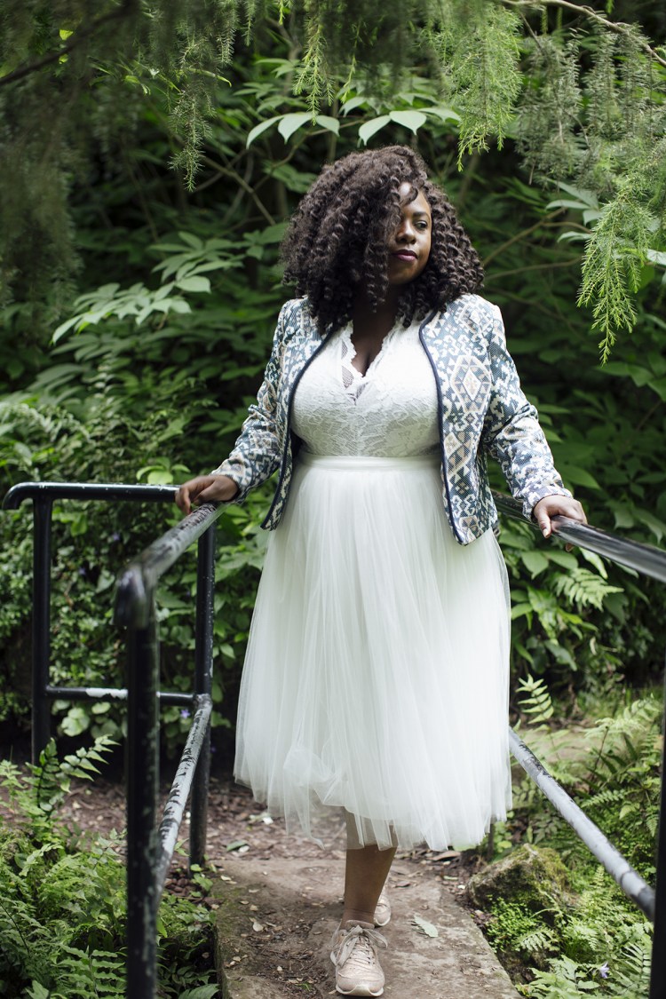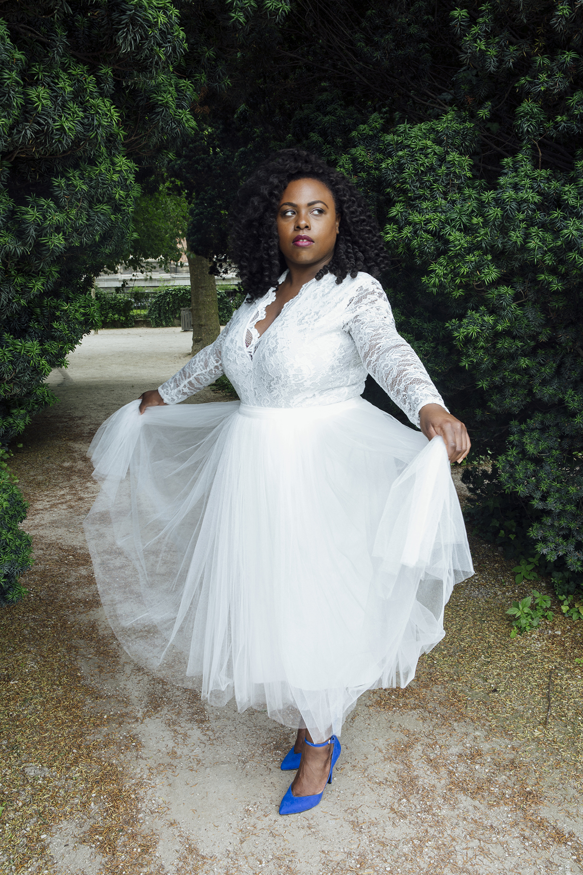 Reproduire le look: Body en dentelle blanche – Boohoo ici, Jupe en tulle blanche – Asos ici, Sandales bleues – New look similaires ici ou là