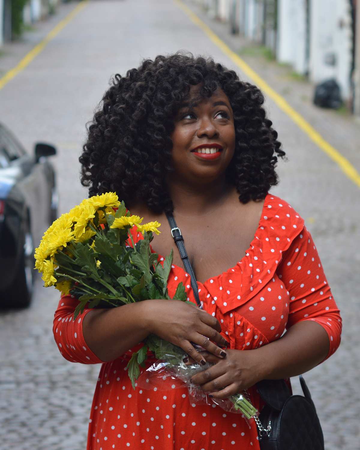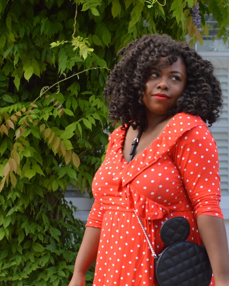 Reproduire le look: Robe à pois rouge – Asos similaire ici, la Chaussures – Monsoon (old) similaire ici ou la, Veste en Jean avec des perles – Monki en solde ici, Sac Mickey – Primark.