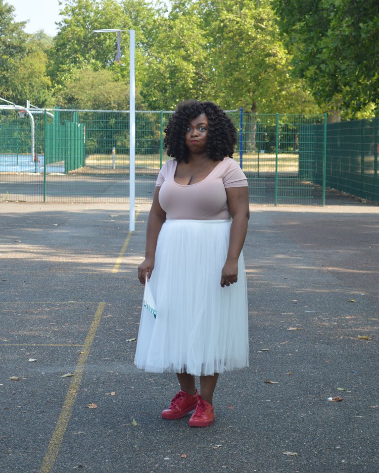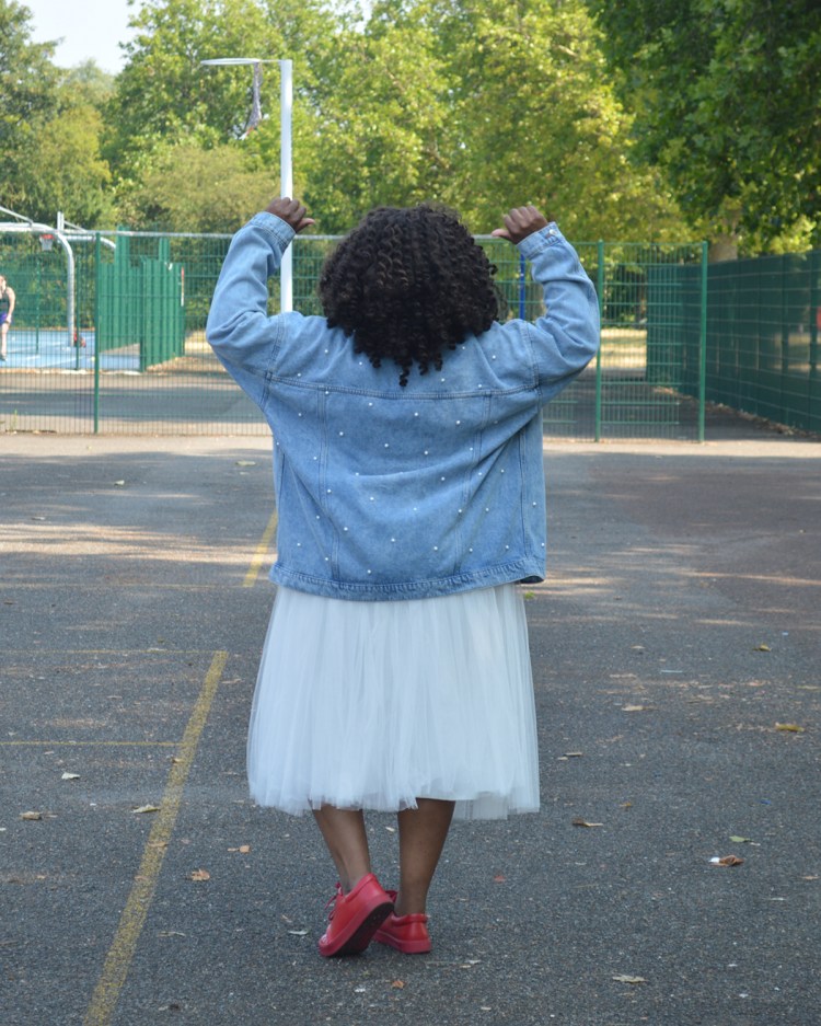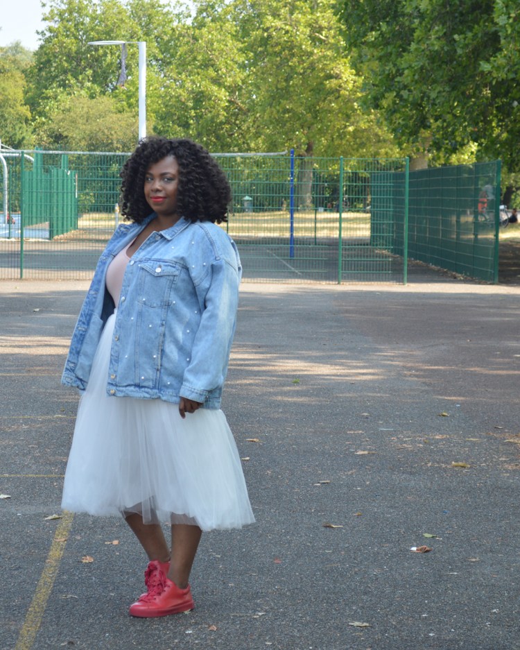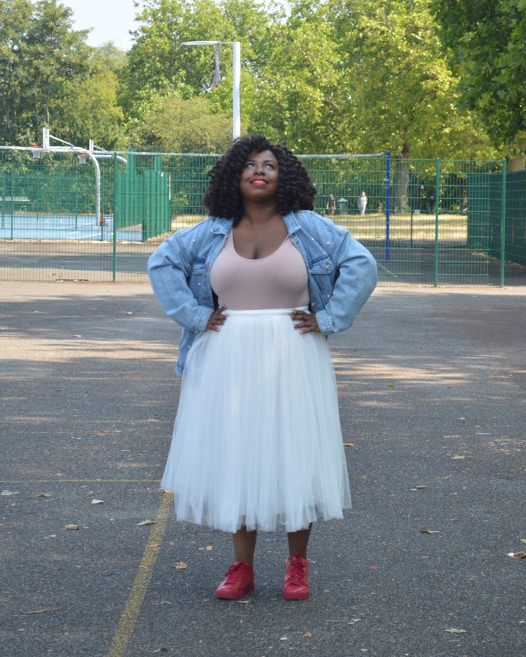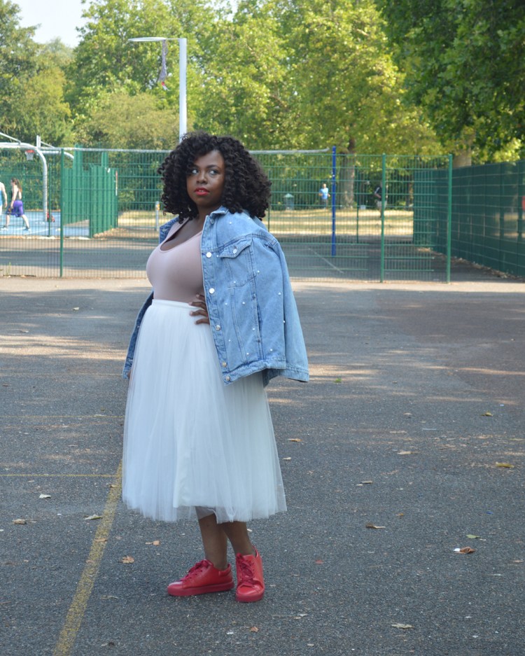 Reproduire le look: Jupe en tulle blanche – Asos/ Little Mistress ici , Body – Forever 21 (old), Veste en jean – Monki (en solde!) ici , Basket rouge – Monki ici