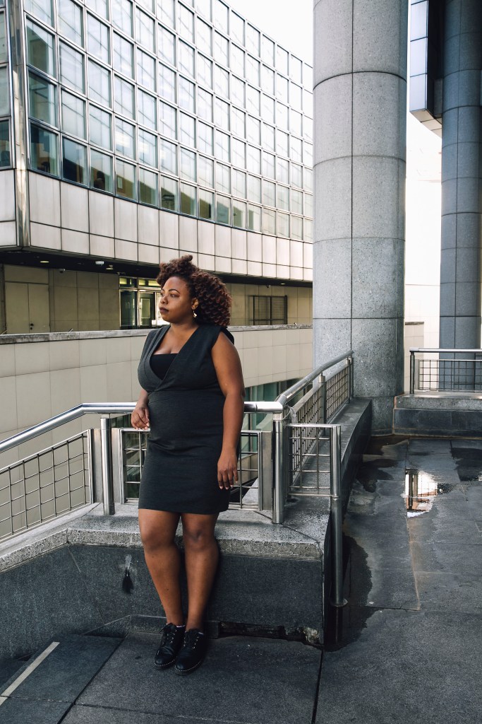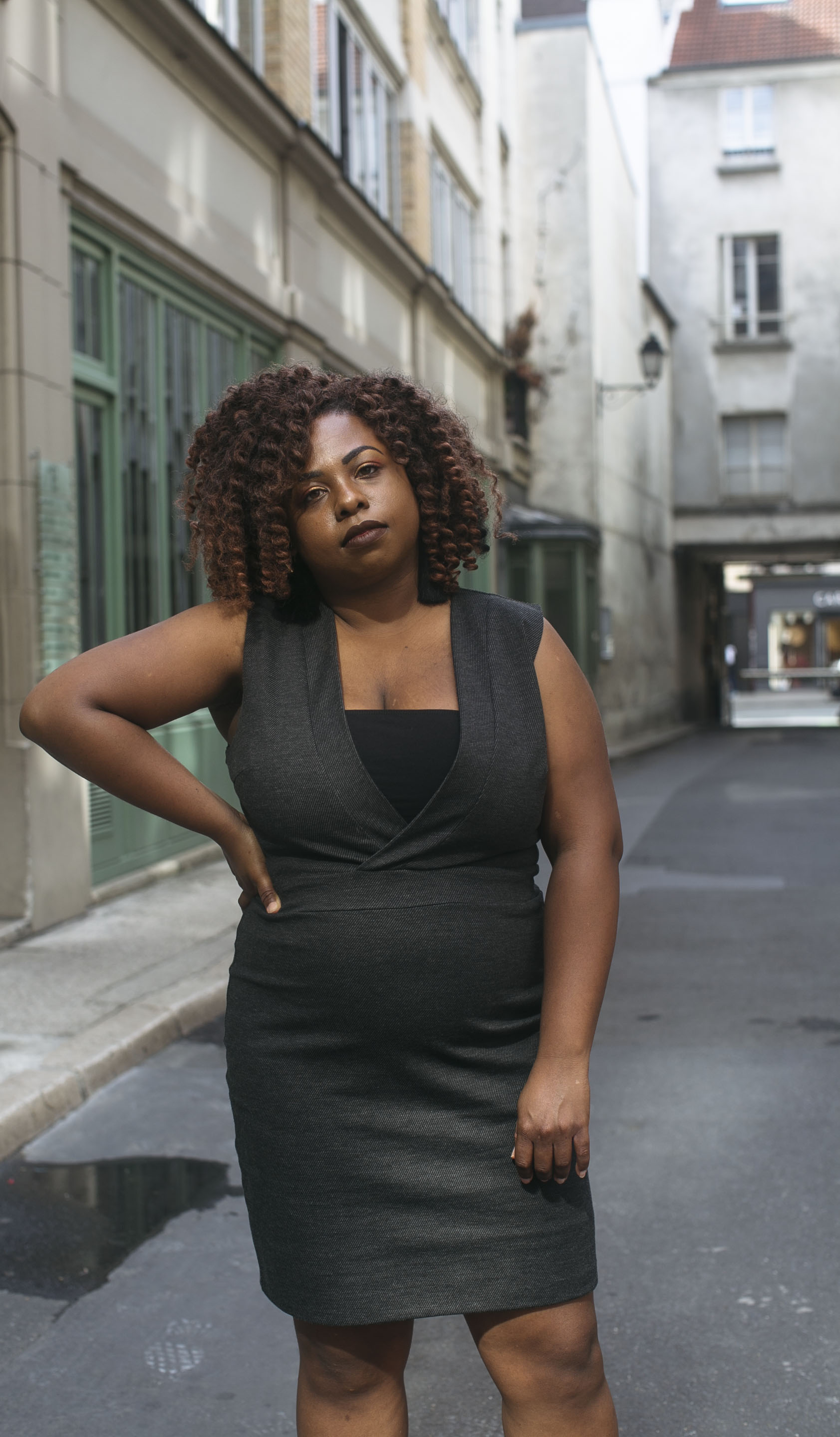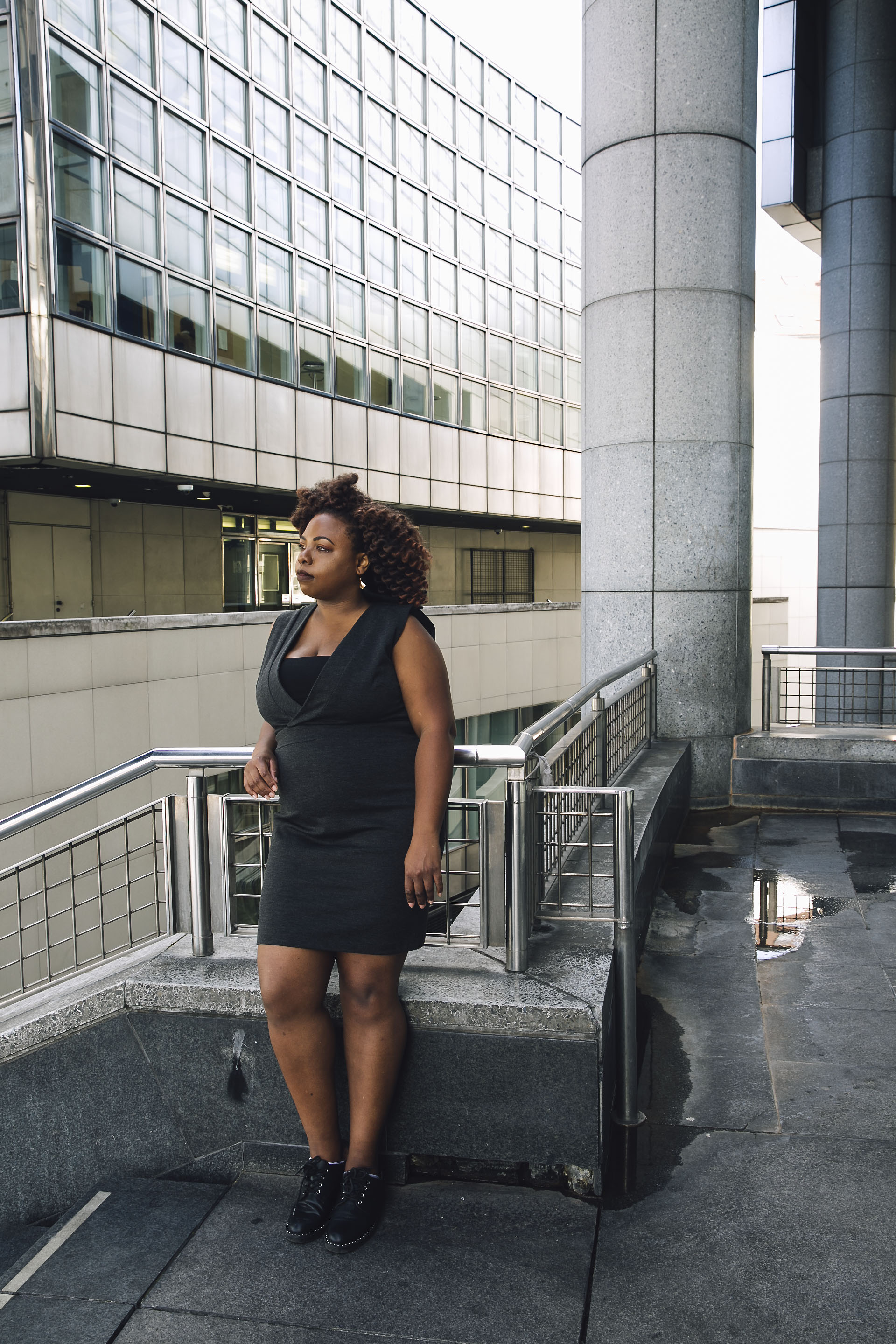 Hello! Aujourd’hui, je vous présente un look que je porte régulièrement pour aller au boulot. Je travaille dans le digital. Le code vestimentaire est assez décontracté. Certains de mes clients viennent de secteurs d’activité plutôt rigides. Du coup, je m’adapte en portant ce genre de robes. J’aime beaucoup la mettre. Je la portais un bandeau noir ce jour là mais en hiver je mets plutôt un sous pull avec un col roulé.
