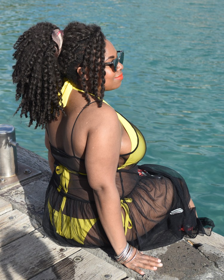 J’ai acheté le maillot de bain jaune fluo de l’enseigne Asos qui a retourné internet l’année dernière mais je n’avais pas eu l’occasion de le shooter jusqu’à présent. Entre deux vidés avec Miss Natïaa, nous avons eu le temps de faire une séance photo aux Anses d’arlet qui se trouve au sud de la Martinique. Je voulais une photo sur l’un des pontons les plus connus de l’île. Je porte par dessus une robe transparente de chez Monki. Je ne suis pas allée dans l’eau avec la robe. Je l’ai mise pour créer une tenue pour le shoot. Je la trouve pratique dans le cas où il y a un peu de vent ou pour une fête sur la plage.