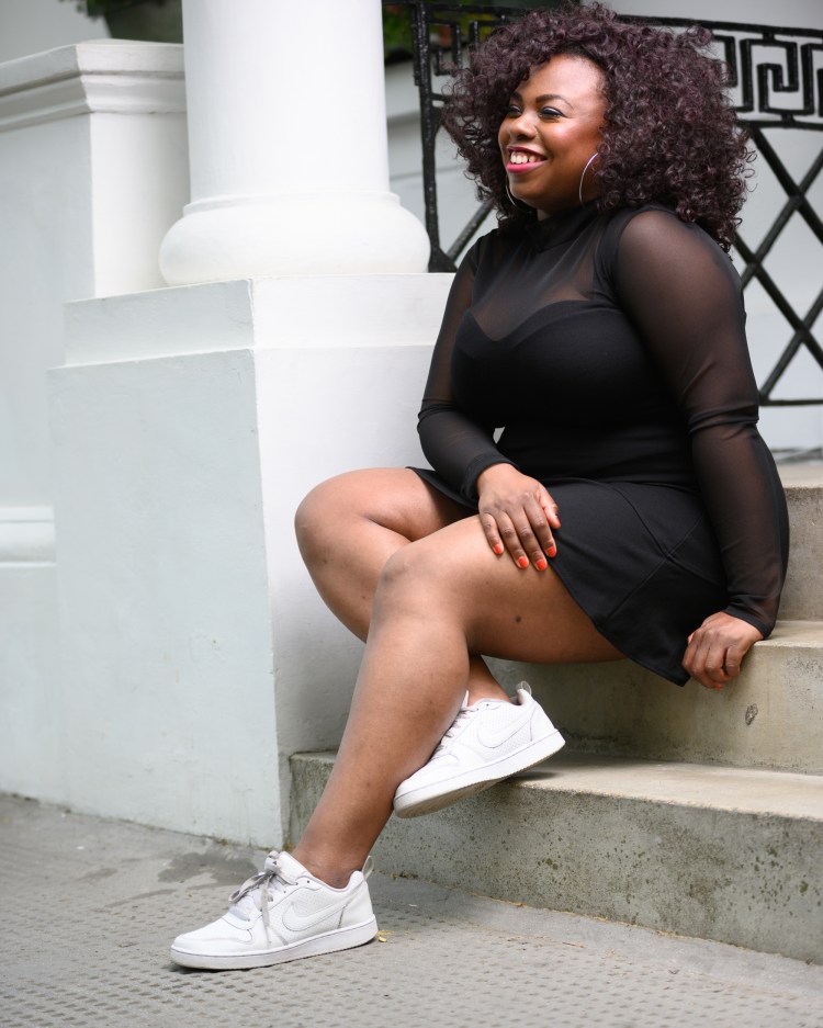 Hello, comment va? La tenue du jour a presque été improvisée le jour du photoshoot! J’ai enchaîné plusieurs looks pour cette séance photo. Entre chaque tenue, je mets ma paire de baskets pour avancer vite dans spot à l’autre. Nous avons fait quelques tests photos alors que je portais encore mes tennis et je me suis dit que ça faisait stylée en fait. Alors voilà! aujourd’hui, je retourne à une de mes influences favourites: le sporty chic. C’était d’ailleurs le thème du tout premier challenge French Curves auquel j’ai participé ici. Ce look est aussi sexy que confortable. C’est un combo qui n’est pas facile à obtenir. Je porte une jupe achetée dans un magasin Loft qui se trouvait sur Times Square à Manhattan. Le top est un body soldé que j’ai déniché sur le site de Boohoo.