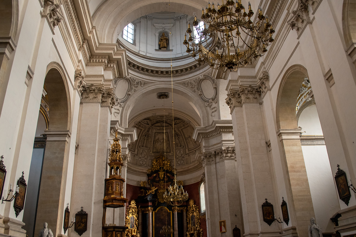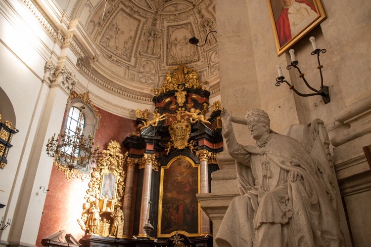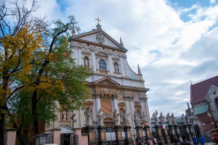 L’ église Saints Pierre et Paul est gratuite. Je m’y suis donc engouffrée. J’aime beaucoup visiter les églises. Ce sont des endroits calmes où je peux m’entendre penser. J’ai été interpellée par la façade avec les statuts des 12 apôtres. Elle a été construire par des Jésuites entre 1597 et 1619. C’est une église de style baroque.