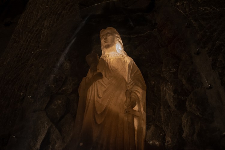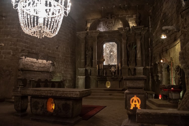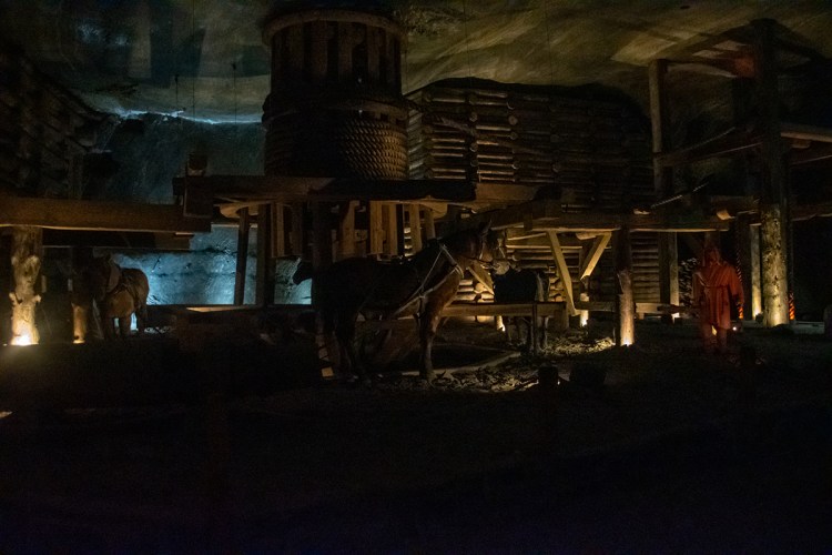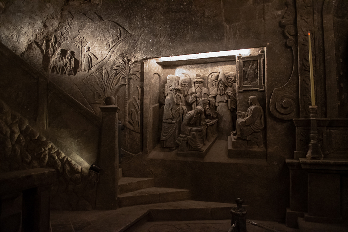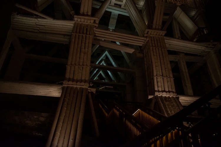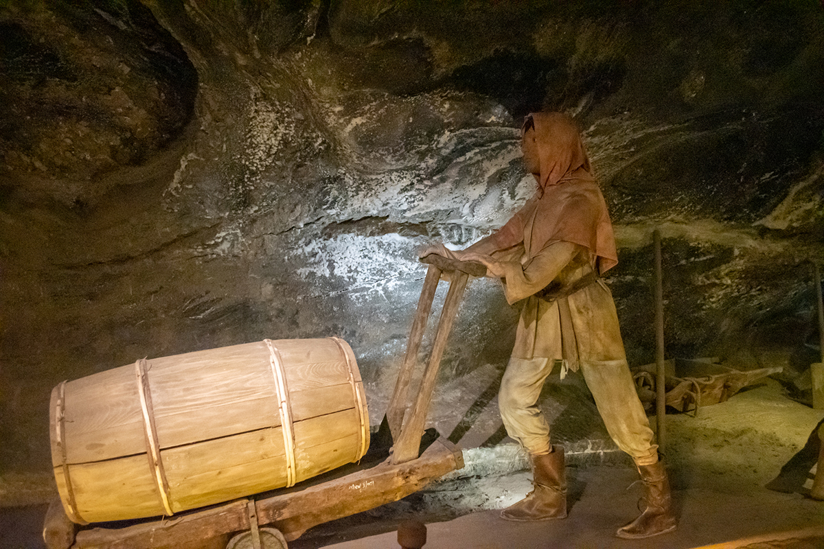 La visite commence par la descente d’un escalier à 64 mètres pour visiter les mines. Nous descendons une série interminable de marches. Attention à la sensation de tournis. Les premières galleries sont une exposition qui expliquent comment le sel était extrait des mines. Le travail était harassant voire dangereux pour les mineurs. Ils devaient gérer les émanations de gaz, ne pas voir la lumière du jour et transporter les roches. La mine de sel était devenue un pilier important de l’économie de la région au point qu’une véritable vie sociale s’est développée sous terre. Plusieurs chapelle ont été créés pour permettre aux mineurs de se recueillir. Puis, on accède à la chapelle Saint- Cunégonde. C’est une salle majestueuse. Il y a des hauts plafond, des statues et de nombreuses sculptures représentant des saints. Tout est fait en sel! C’est impressionnant. La salle peut être réservée pour des mariages ou d’autres cérémonies. Puis, nous avons un stop dans une première boutique de souvenirs. La seconde partie de la visite est la suite de l’exposition. Là on découvre des lacs où l’eau est fortement concentrée en sel. Il est très difficile d’y nager.