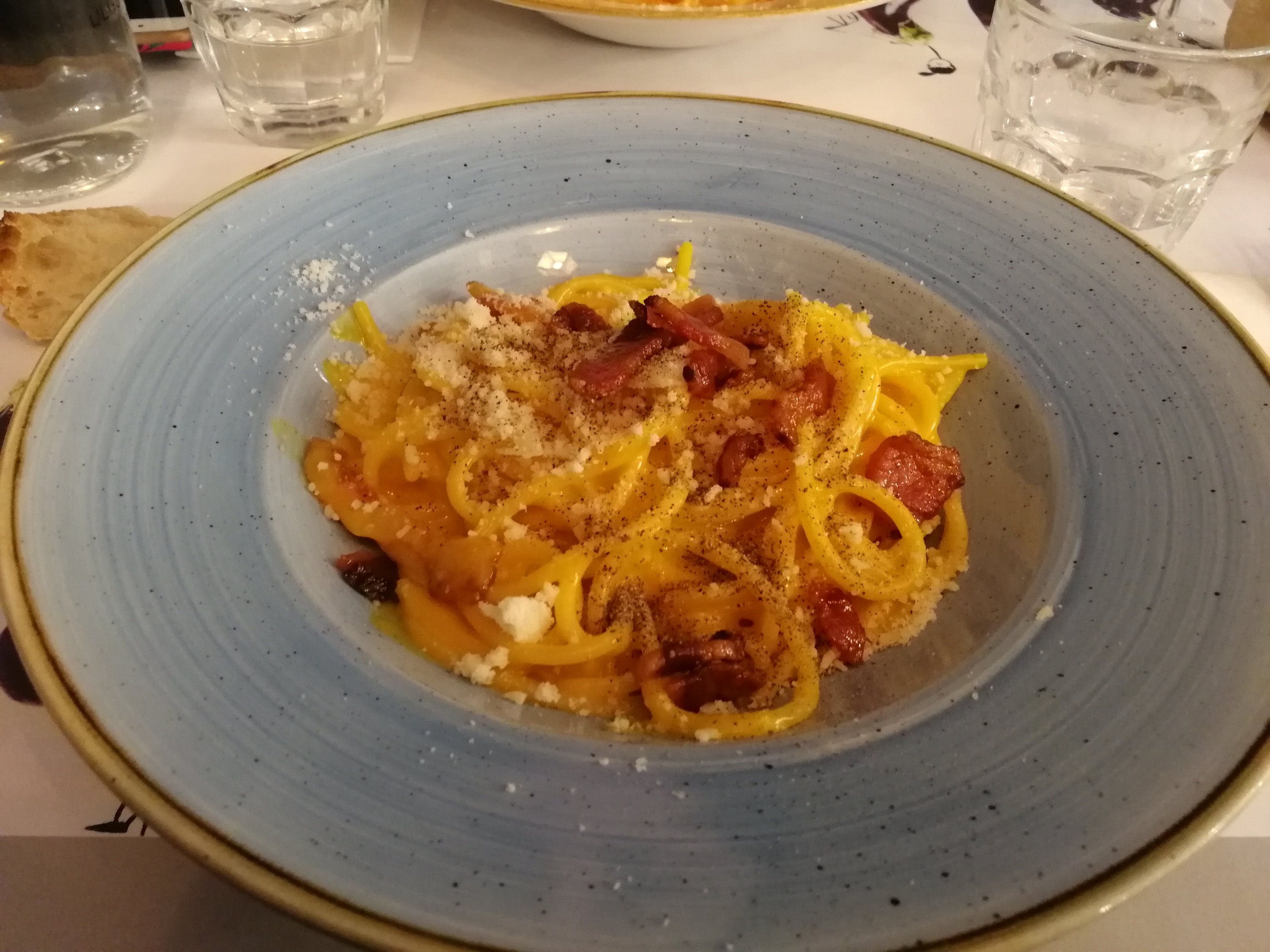 J’ai mangé mes premières carbonara italiennes! Ce fut délicieux! Mais j’ai trouvé le plat un peu salé. Le jaune d’oeuf était déjà utilisé comme liant.