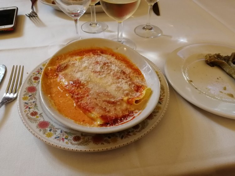 Ce n’était pas le restaurant que nous avions repérés sur google. Le fameux restaurant était complet. La Trattoria Tritone était à côté. J’ai beaucoup aimé la décoration traditionelle. J’ai goûté les artichauts à la romaine. Les artichauts sont bons mais je n’ai pas été époustouflée personnellement. ll n’y avait pas vraiment d’assaisonnement a part l’huile d’olive. J’ai ensuite opté pour des cannellonis. Il faut savoir qu’en Italie, les plats de pates sont en faite des entrées!