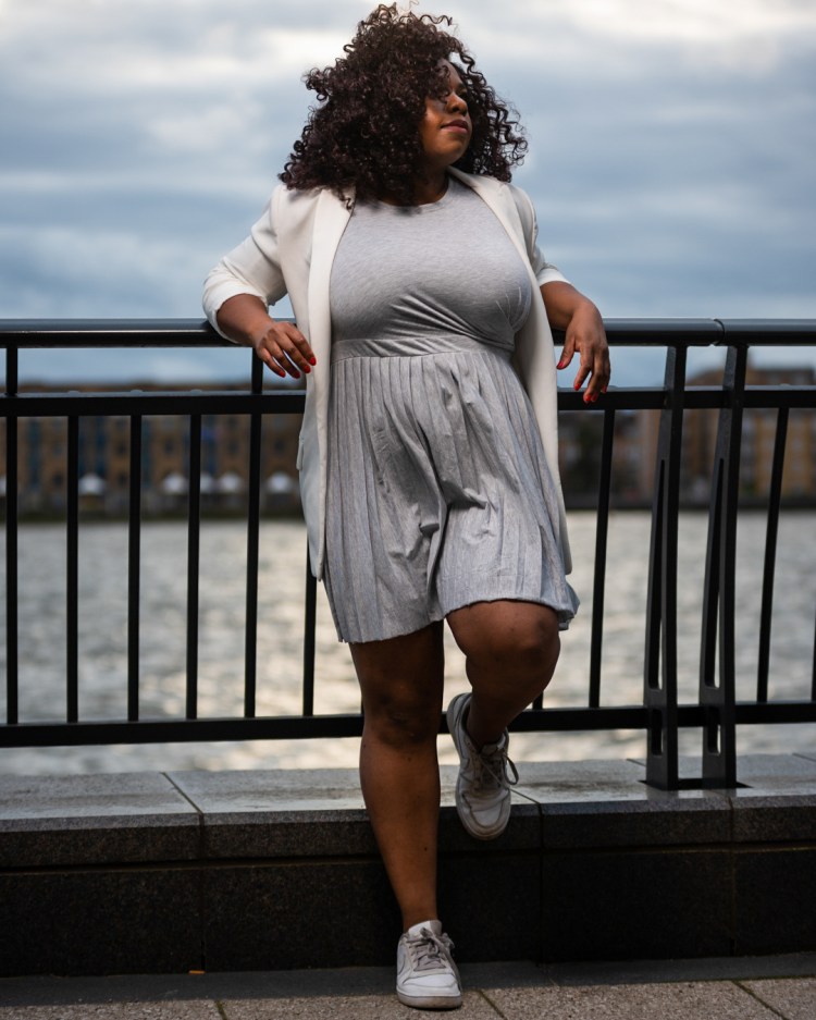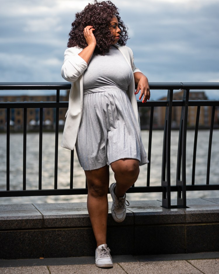 Reproduire ma tenue: Robe grise plissée – Asos ici, Blazer – H&M (old similaire ici ou là), Basket Nike similaire ici
