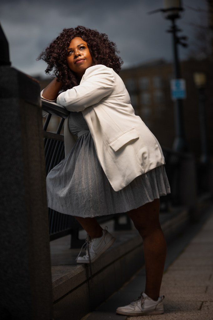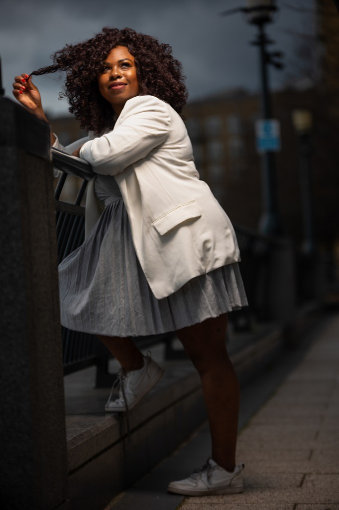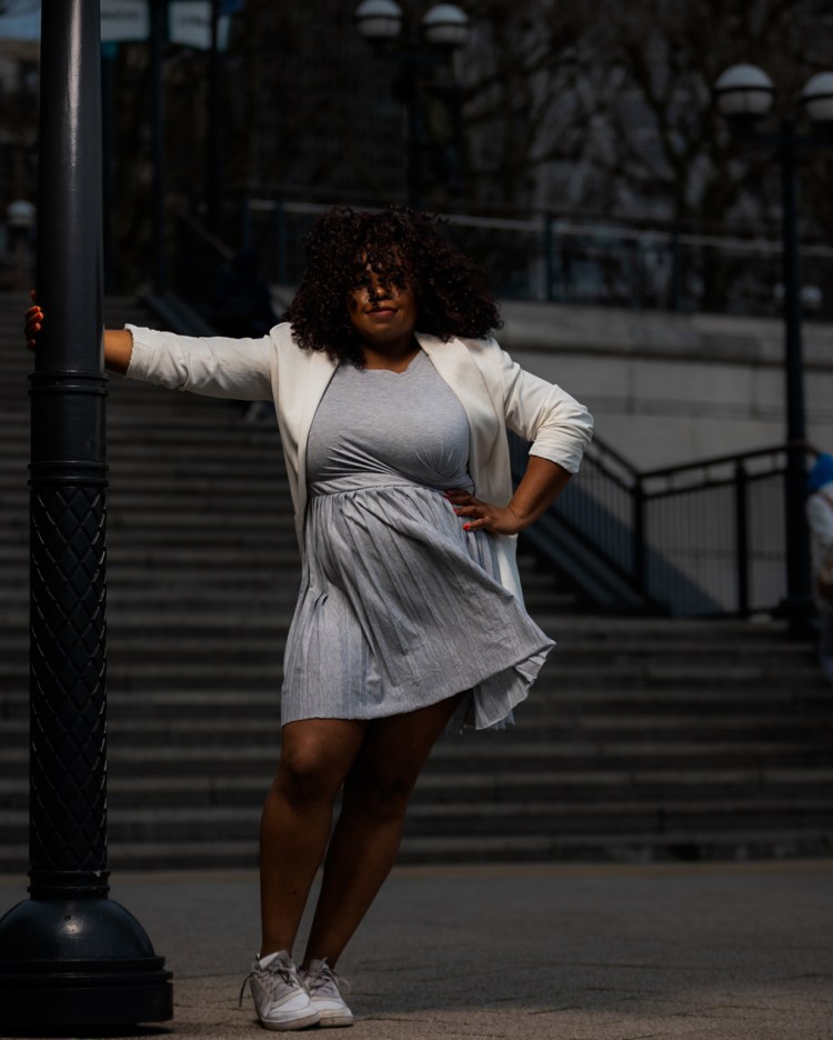 J’ai eu le temps de faire une série de photos avec Sony avant le confinement en Mars dernier. La tenue du jour est une tenue que j’ai porté au travail. Plus généralement, mes tenues de travail sont relativement décontractées. Je dois m’adapter à mon interlocuteur en fait. Si je dois voir une organisation financière, je vais m’habiller très sobrement. Être bien dans ma tenue est essentielle quand je dois voir un client. Ça m’est déjà arrivée de retourner chez moi pour me changer avant de rencontrer le client! La dernière chose dont j’ai besoin est de m’inquiéter à l’idée que le bouton du chemisier puisse craquer à tout moment! J’aime beaucoup le mélange des genres avec une robe workwear utilisant une tissus qui rappelle le sport wear. Je trouve que des tennis blanches s’accordent toujours bien avec ce genre de look.