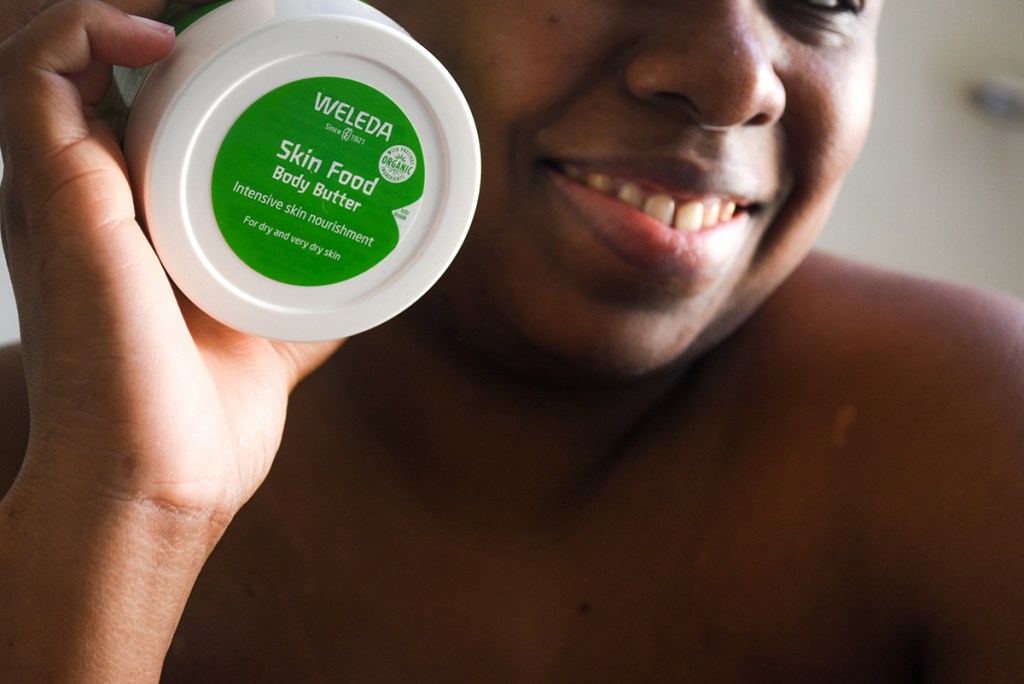 Salut, comment vas-tu? Ma soeur m’a offert un coffret plein de produits de beauté pour Noël. J’ai plein de trucs à tester du coup! Parmi les produits, il y avait le Skin Food – Baume corps de la marque Weleda. L’application d’une crème pour le corps est une étape importante de ma routine. J’aime beaucoup la texture entre le beurre et la crème hydratante. L’odeur me rappelle les baumes à lèvres verveine-orange. ce qui n’est pas étonnant d’après la description du produit: « Faisant partie de la gamme Skin Food de la marque, l’hydrateur exploite les pouvoirs des extraits de plantes avec des couleurs apaisantes Viola Tricolor, Calendula et Camomille pour harmoniser la peau, tandis que le beurre de Karité et de Cacao nourrit intensément. Peau délicatement parfumée aux arômes de lavande et d’orange douce, la formule végétalienne emprisonne une hydratation longue durée pour laisser la peau lisse, souple et confortable. » Les promesses de la marque sont tenues pour moi. J’ai une peau à tendance sèche. Ce baume est riche mais il ne laisse pas un fini gras sur la peau pour autant. Il laisse ma peau hydratée grâce à l’eau and la glycérine inclut dans la composition. Ses vertus emollientes et adoucissantes viennent probablement de l’huile de tournesol, du beurre de cacao, et du beurre de karité. Le baume est assez épais donc il faut masser la peau un petit temps pour le faire pénétrer.