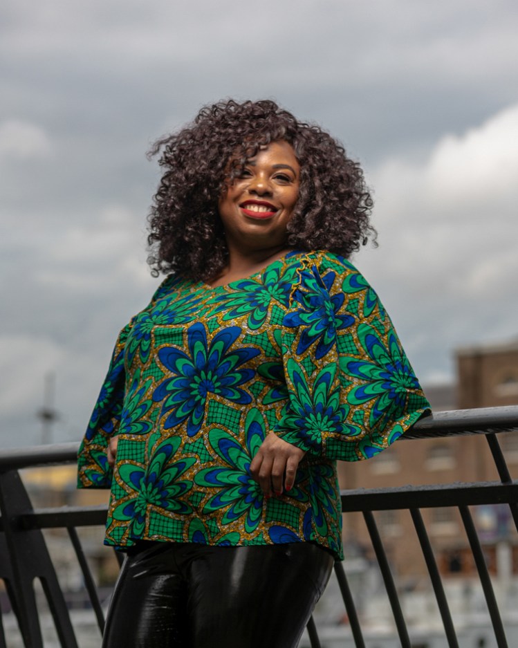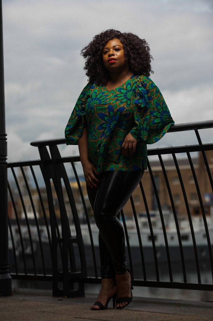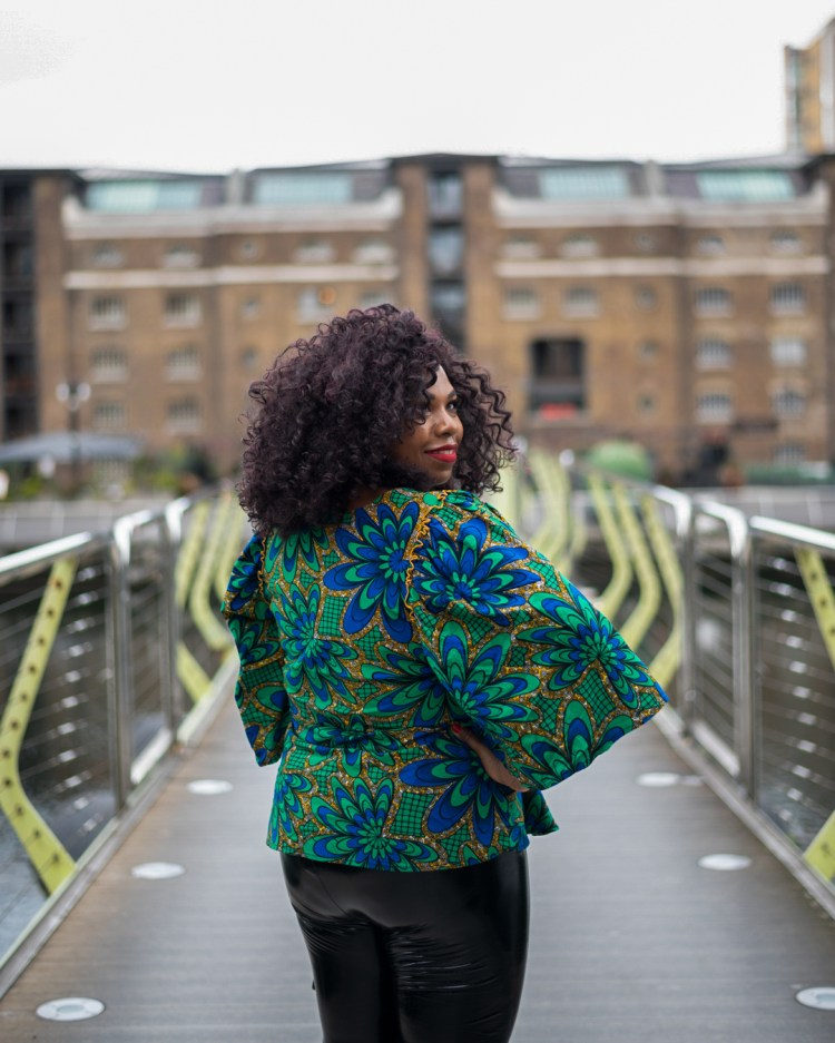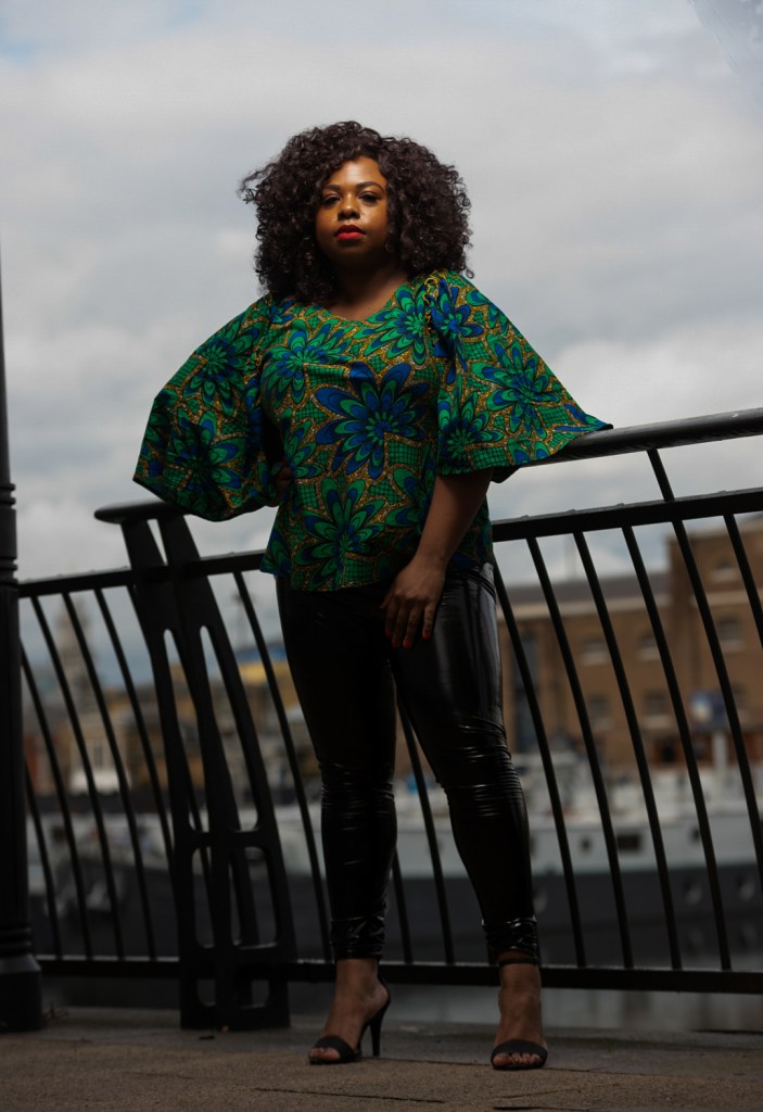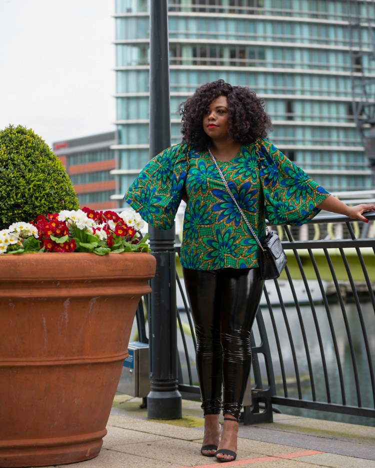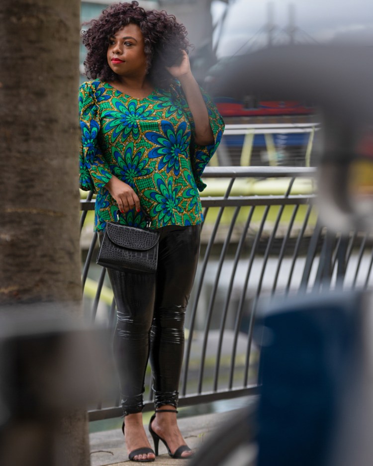 Je souhaite participer à la démocratisation des imprimés africains et antillais. Tout est possible. Nous portons bien des vêtements à pois alors que ce type de tissus vient d’Espagne. J’ai porté du wax avec de la dentelle et jean ici, avec du cuir ici, en mode sporty chic ici. Aujourd’hui, je l’associe dans un look soirée romantic/clubbing. Je n’ai pas vu beaucoup de look avec des leggings vinyl.